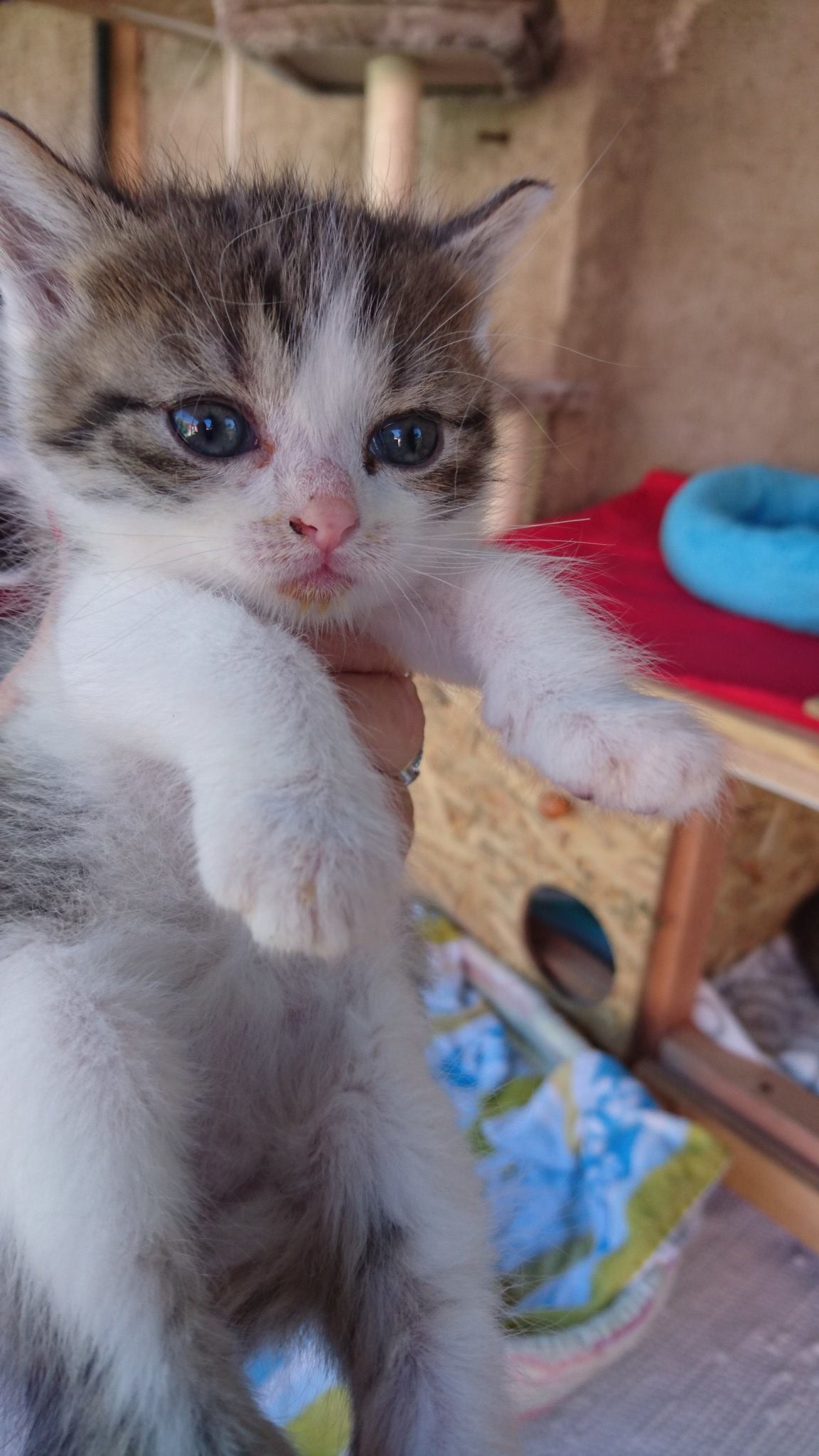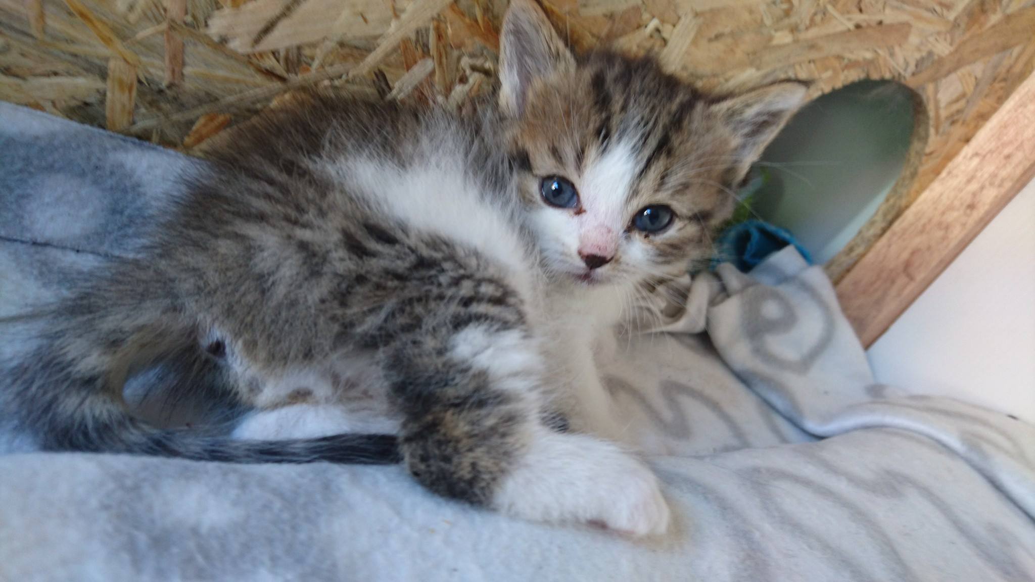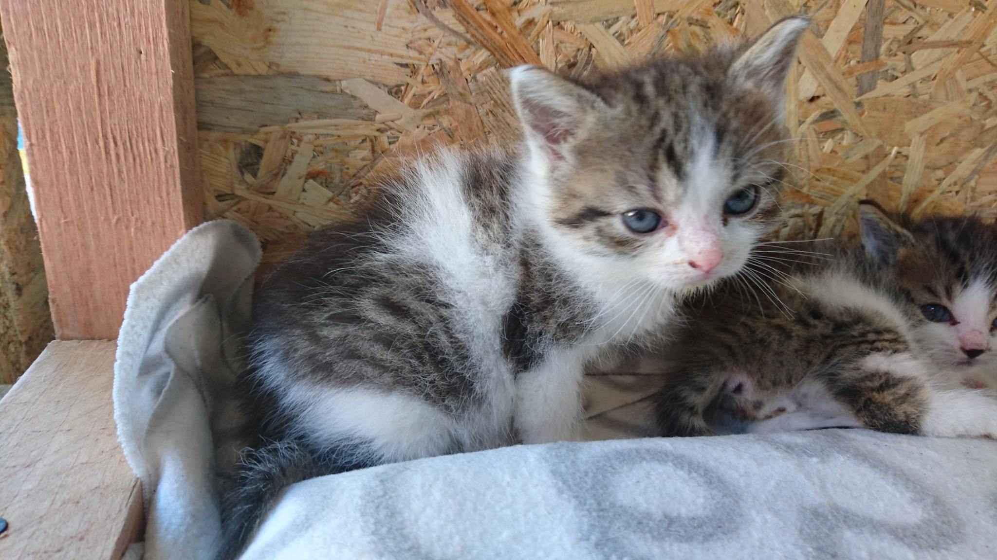 Nově přijatá čtyři koťátka s maminkou z jedné vsi, kde tři koťátka byla odsouzena ke smrti, nebyl o ně zájem, pouze jedno koťátko mělo mít novou rodinu. Zachránila je jedna kočkomilka, které se nakonec podařilo dostat od majitele i kočičku se čtvrtým koťátkem. Koťátka však onemocněla, bezvládně ležela a třásla se a tak se obrátila na Sluníčko s prosbou o pomoc. Jedná se o tři holčičky – černobílou Dianu, bílomourovatou Kate, bílomourovatou více flekatou Charlotte, bílomourovatého kocourka Williama a bílou maminku Pipe s tmavými fleky. Po příchodu k nám jsem viděla, že koťátka mají horečku, což skutečně tak bylo. Dále mají ouška plná svrabu včetně maminky, která má i hodně tekoucí očička. Byla jim píchnuta antibiotika. Dnes dopoledne měly horečku všechny čtyři koťátka. Je jim zhruba kolem pěti týdnů, jsou to mazlivky a za plotem voliéry se domáhají přítomnosti člověka. Koťátka váží od 340 do 430 gramů. Úplně nejmenší je kocourek William a kočička Charlotte. Snad tu váhu brzy doženou.