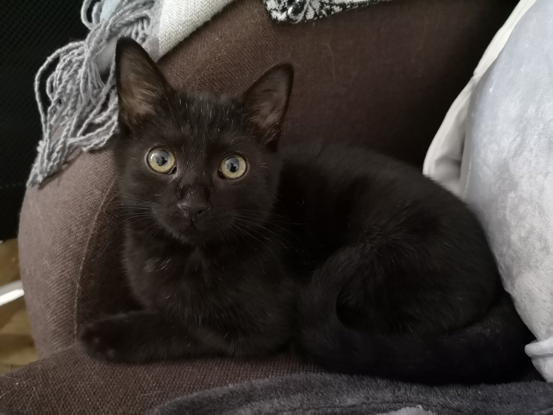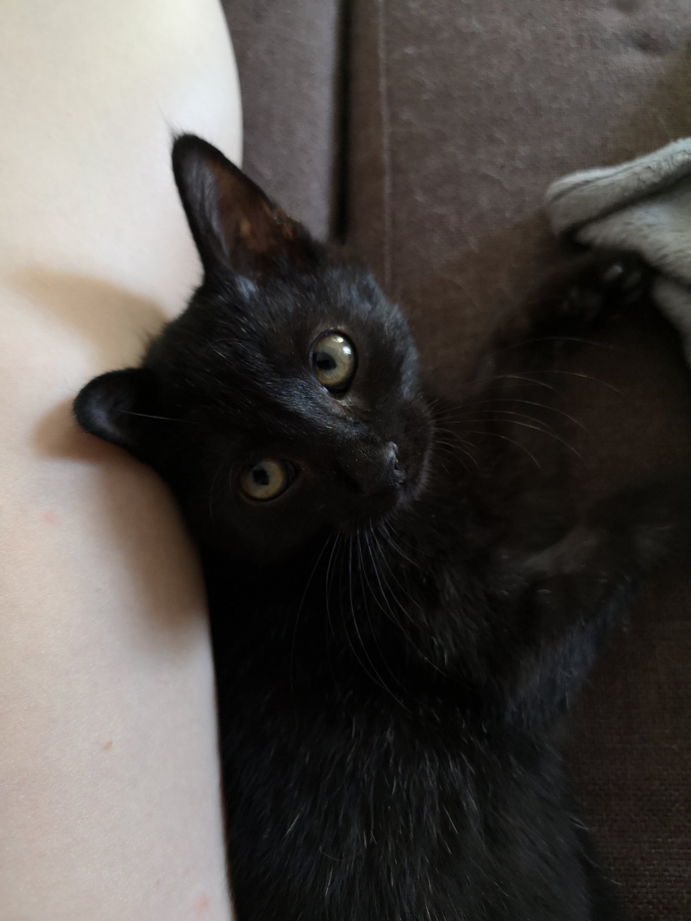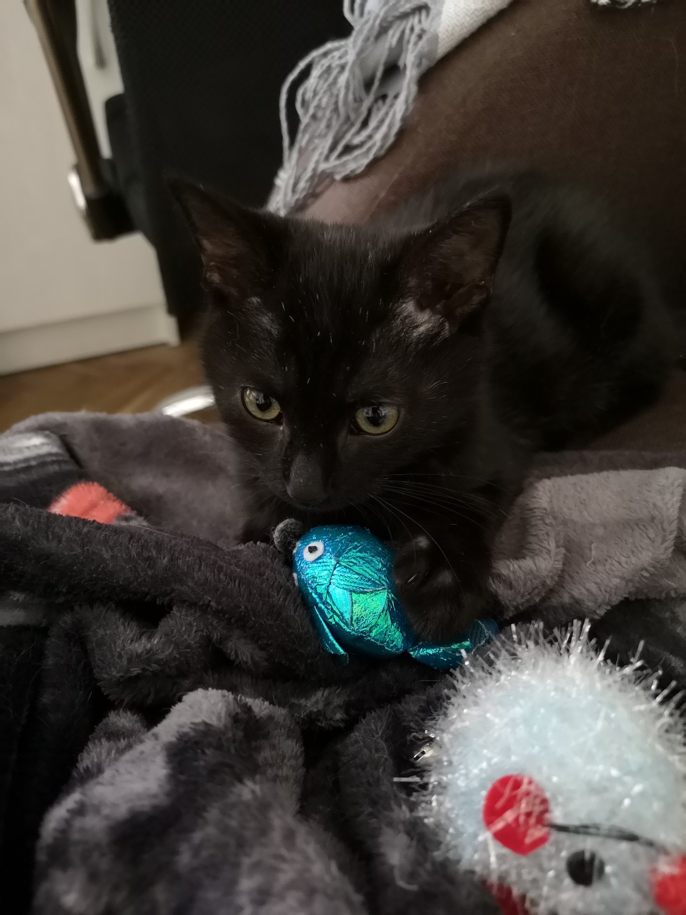 zasíláme pozdrav do Sluníčka a fotky z nového domova. Žíža (Orion) si první den pečlivě prohlédl celý byt, pohrál si snad s každou hračkou, kterou zde má a téměř pořád chodí za námi. 😀 Má chuť k jídlu i pije a ukázkově používá záchůdek. Trochu nás potrápil malý průjem z toho všeho dění kolem, ale probiotiky od paní veterinářky by se to mělo co nevidět spravit. 😊 Naše dvě kočky ho zatím přijaly s odstupem za doprovodu syčení a vrčení. Ovšem už dnes je na jejich společném soužití vidět alespoň malý pokrok! Už se pomalu očichávají a tu a tam kolem sebe projdou bez výhrůžek. 😊 Vše chce čas, koneckonců ani ti dva původně nebyli kamarádi přes noc. Rozhodně se jimi nenechá rozházet. Je to velký mazel a i když mě ráno vzbudil pěkným kousnutím do kotníku, přešel k hlavě a za hlasitého předení mi umyl obličej. 😀