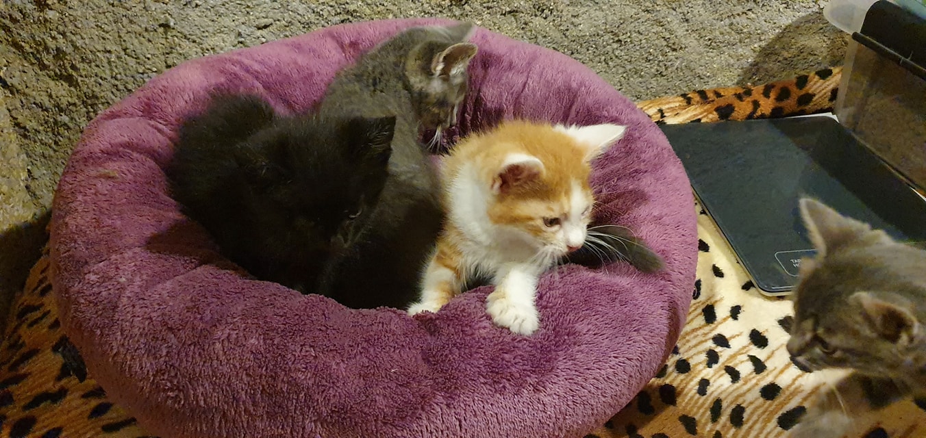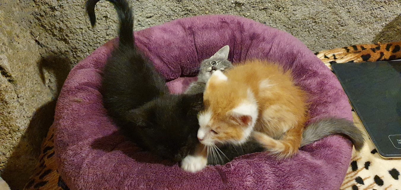🔸 Koťátka od kočičky PUPAVY (tu jsme museli předevčírem oddělit do karantény, velmi hubla a chřadla je v léčbě,….). Nechce nám jist. Tedy nic, krom syrového masa. Což je ještě dobré. Potřebuje zesílit. Koťátka ji dala co proto. Krásně se mazli.