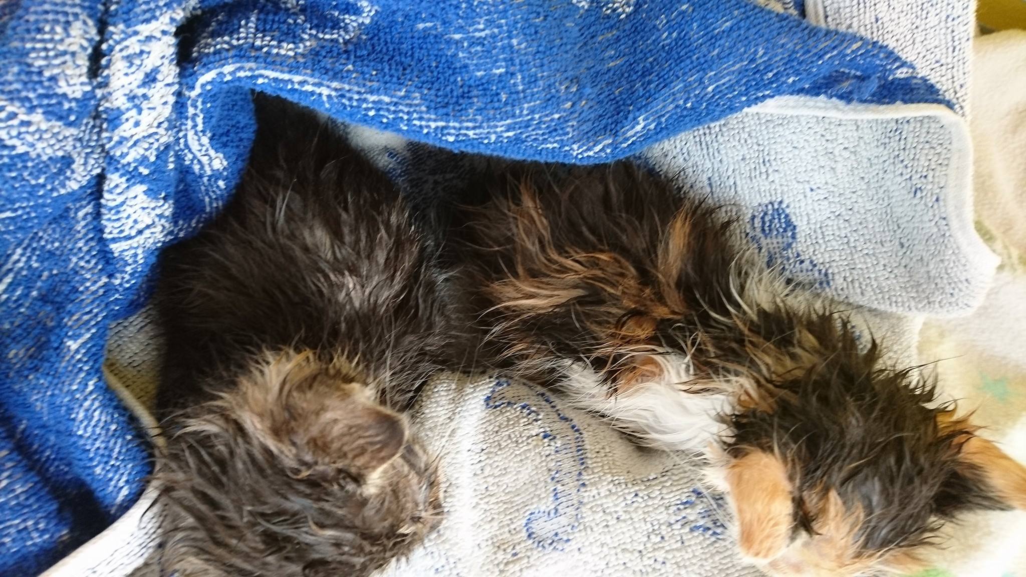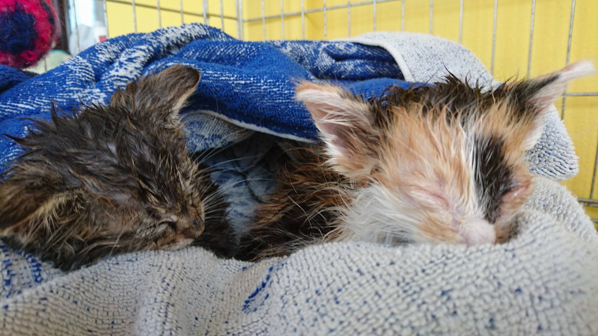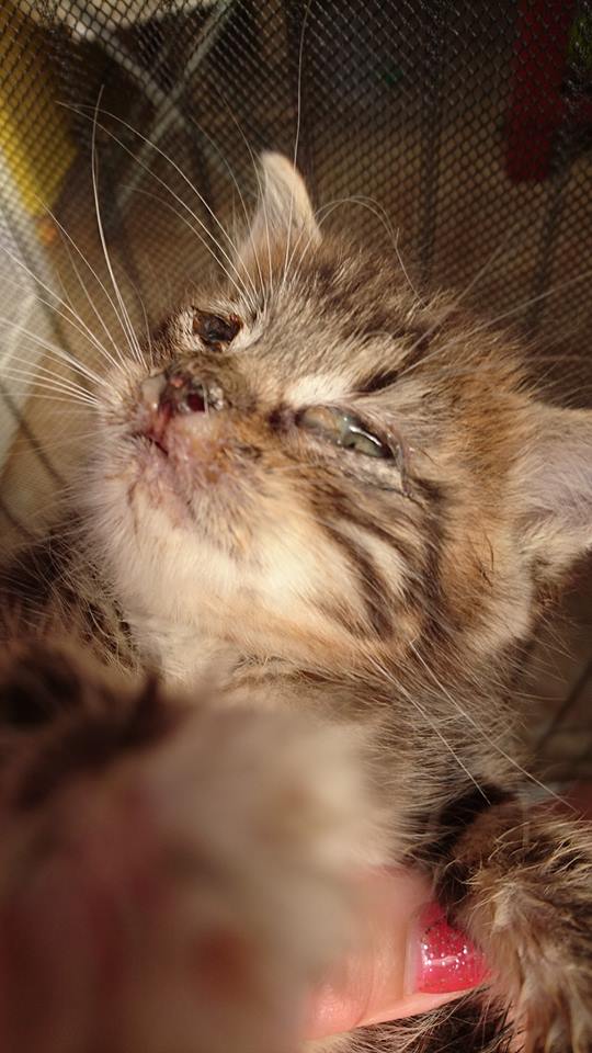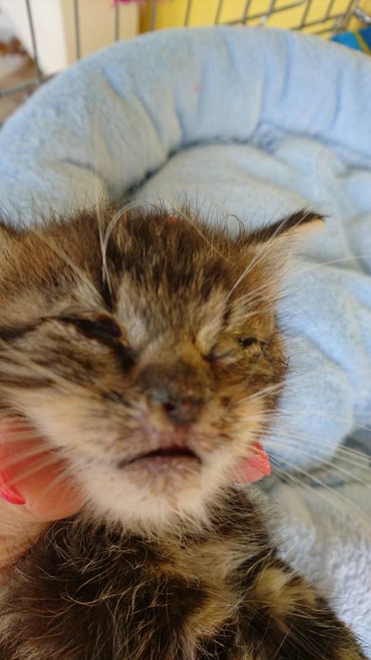 Kocourkovi se očička lepší, rýma zatím neustupuje. Vůbec necítí jídlo, musí být krmeny a voda podávána stříkačkou.