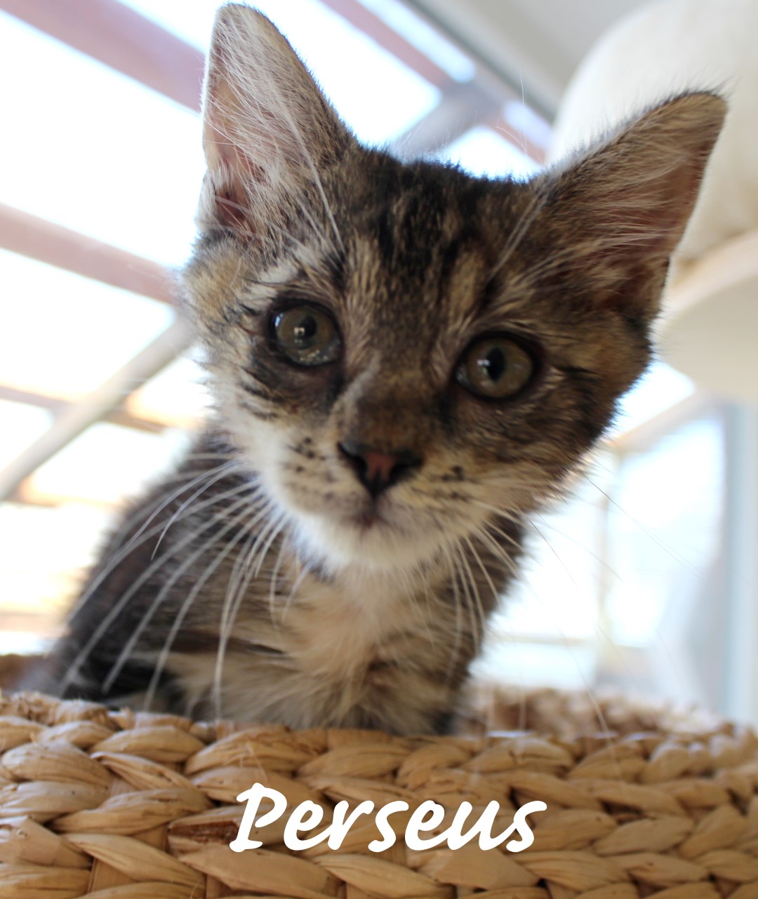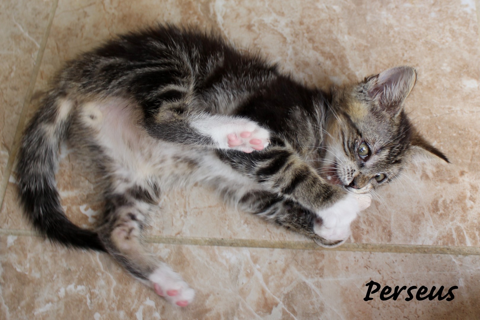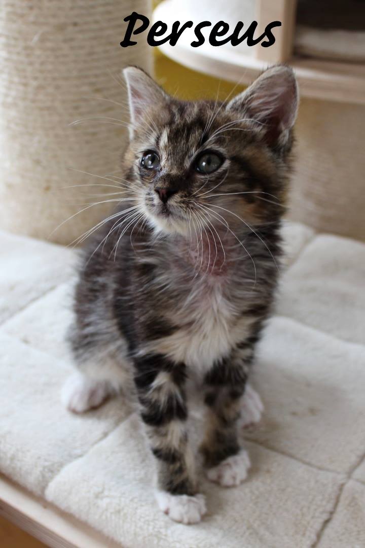 Perseusek už lumpačí s ostaními koťátky, papá, rýmu už nemá, jen jedno očičko stále zlobí, takže se musí mazat. Sestřičku Andromedku už hodně přerostl. Je to zlatíčko.