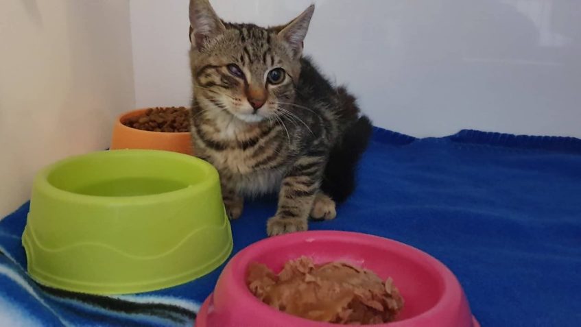Strašpytlík k nám přišel s velmi špatným očkem, které se postupně začalo zlepšovat. Je to maličký bojásek, Pomalu si zvyká, pravidelně mu musíme kapat do očička, nechá se polapit a je trpělivý.