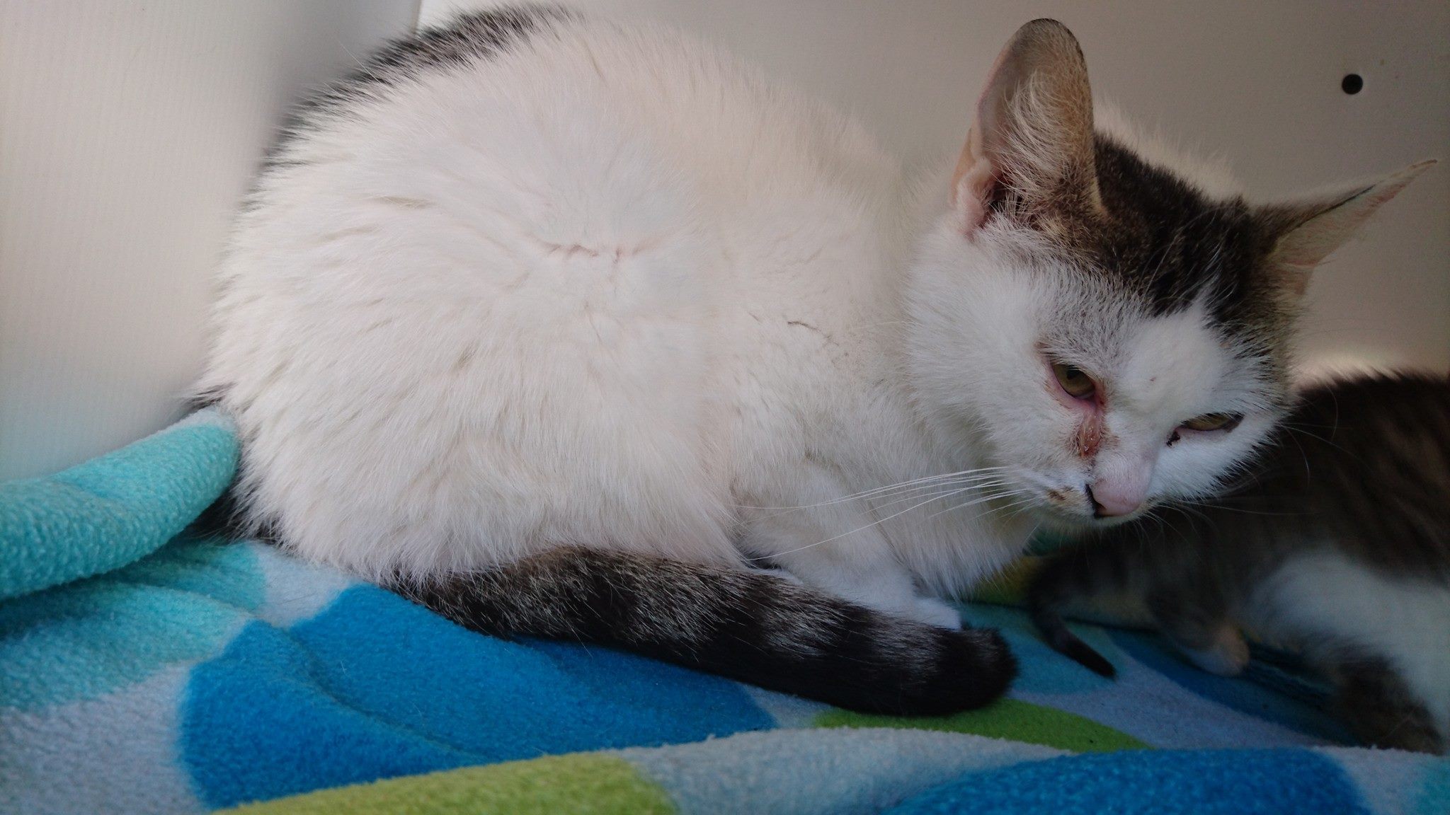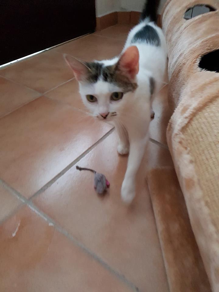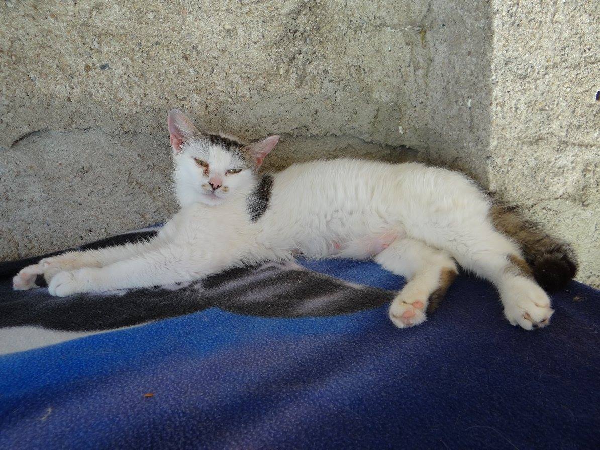 Bílá kočička s mourovatými flíčky, která byla přijata se svými čtyřmi koťátky ze vsi Ředhošť. Koťátka byla odsouzena ke smrti, nebyl o ně zájem, pouze jedno koťátko mělo mít novou rodinu. Zachránila je jedna kočkomilka, které se nakonec podařilo dostat od majitele i kočičku se čtvrtým koťátkem. Koťátka však onemocněla, bezvládně ležela a třásla se a tak se obrátila na Sluníčko s prosbou o pomoc. Po přijetí jsme zjistili, že má kočička plná ouška svrabu a hodně tekoucí očička. Byla jí okamžitě píchnuta antibiotika a snad bude brzo v pořádku. Je velice hodná a trpělivá.