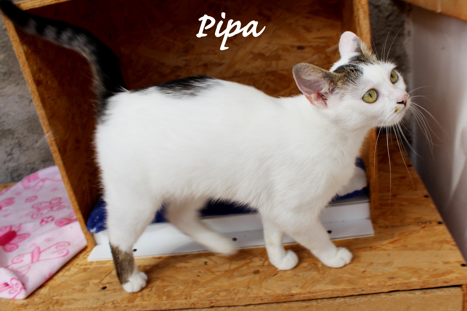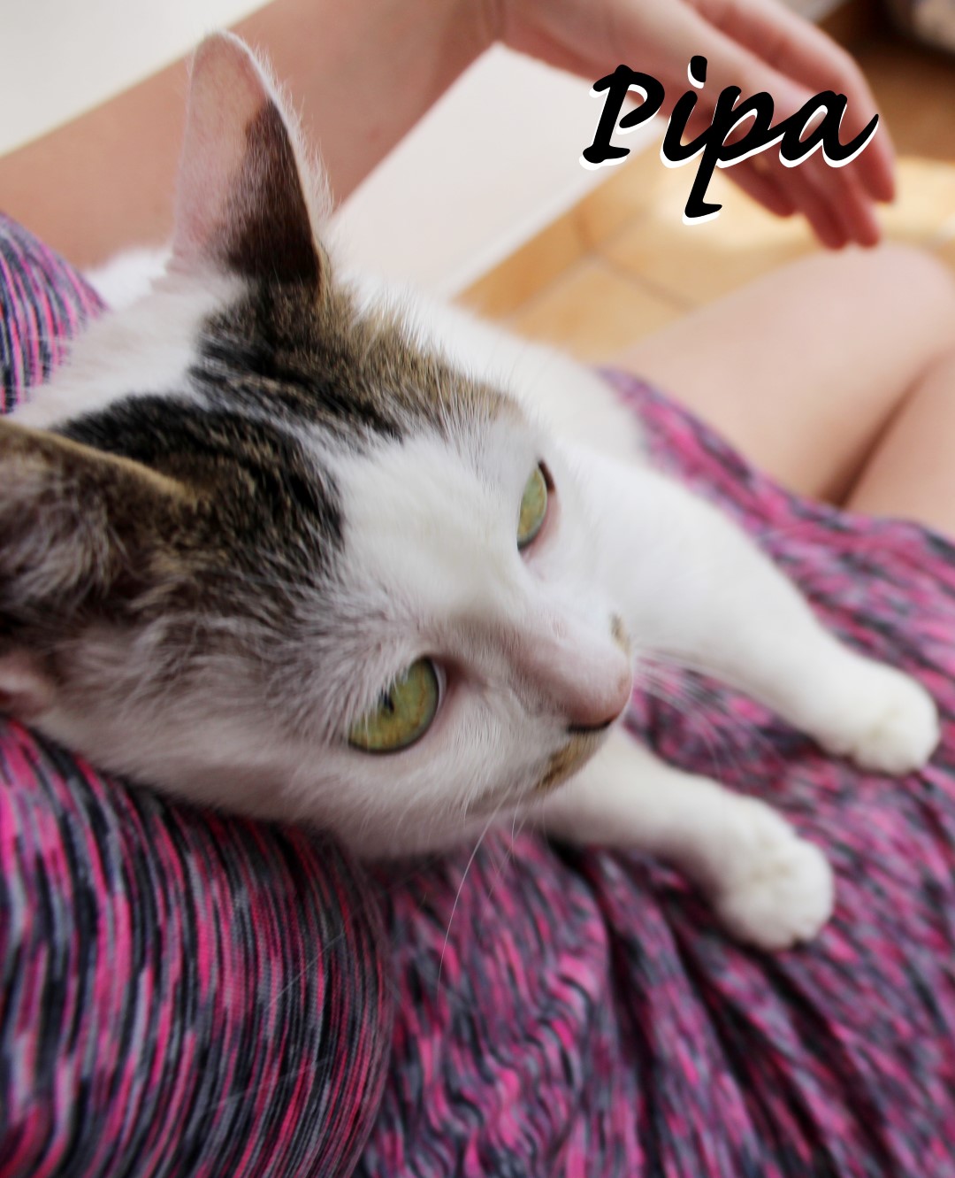 Aktuální info: Pipuška je krásná a mazlivá kočička. Moc by si přála laskavý domov v bytě či domečku se zahrádkou, kde by byla jako jediná kočička. Nehodlá se dělit o svůj vybojovaný „domov“. Je moc hodná a vděčná za pohlazení.