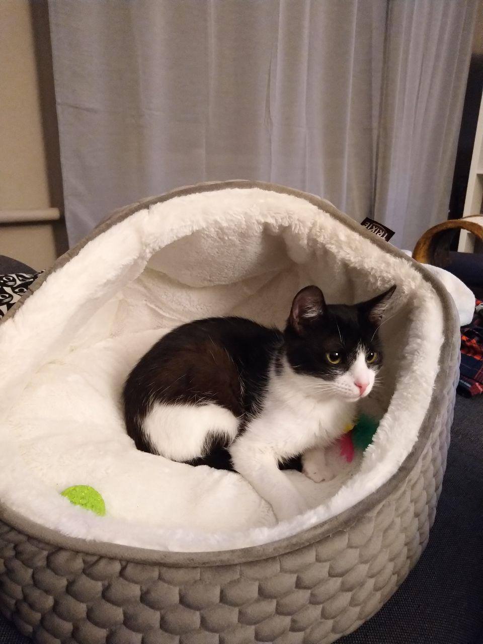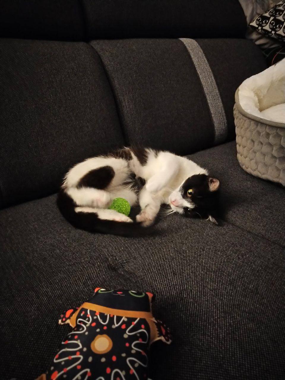 ▪️Dobrý den , posíláme pozdrav od Chňapky, která se rychle zabydluje v novém domově. Už první večer se přišla pomazlit a pohrát si s hračkami. Druhý den se vydala na průzkum bytu a nejvíce si oblíbila akvárko, které ráda pozoruje. Často polehává v posteli a našla si své místečko i ve skříni Prášky společně zvládáme a doufáme, že se kočičce brzy uleví. Co se týče jídla, zatím papá jen granule a na kapsičky nám kašle ale "vynahrazuje" si to různými pamlsky a dobrůtkami, po kterých se může utlouct. Když to shrneme, Chňapce se u nás zřejmě líbí, těšíme se až se osmělí a my jí plně přirosteme k srdci.