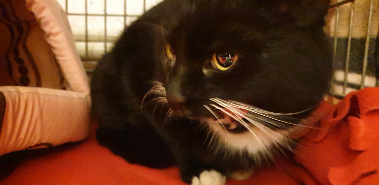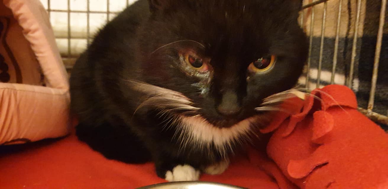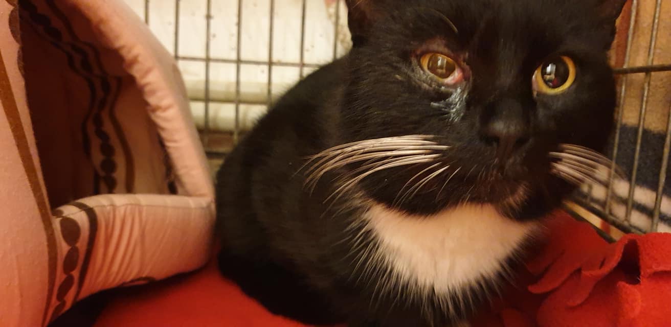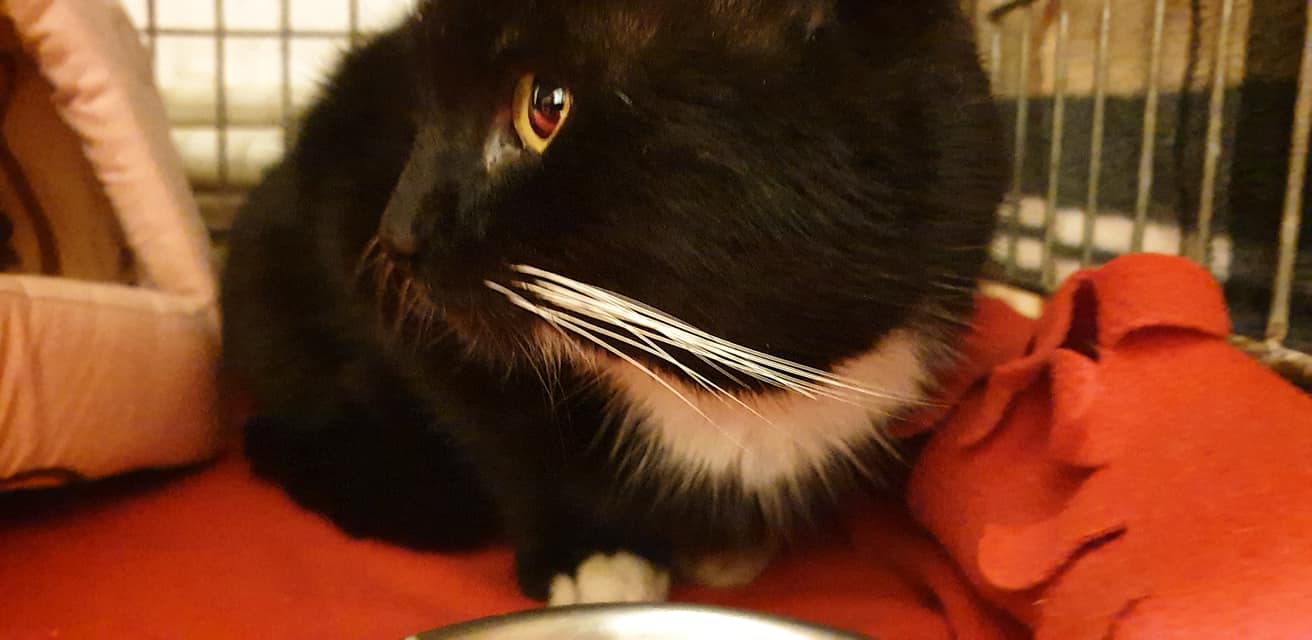 Také černobílý, ale chlupaťák 😀, trochu pohublý a unudlany, kterého se podařilo odchytit na jedné z místních benzinek. Má rýmu a uslzena očka. V lokalitě odkud je, má krásný výběh do polí, na místě má zázemí a boudičku se senem. Pravidelné krmení a spoustu obdivovatelů, měl by se zřejmě vrátit zpět. Uvidíme 😉.
