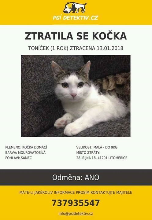 Dobry vecer, chtela bych Vas timto pozadat o pomoc. Ztratil se mi dnes rano Kocourek Tonicek, v Litomericich v ulici 28. Rijna. Probehl z terasy do zahrad mezi domy. Je cipovany (981020000320798). Prosim, kdyby Vam ho nekdo privezl nebo Vas kontaktoval, dejte mi prosim vedet. Moje telefonni cislo je 737935547
