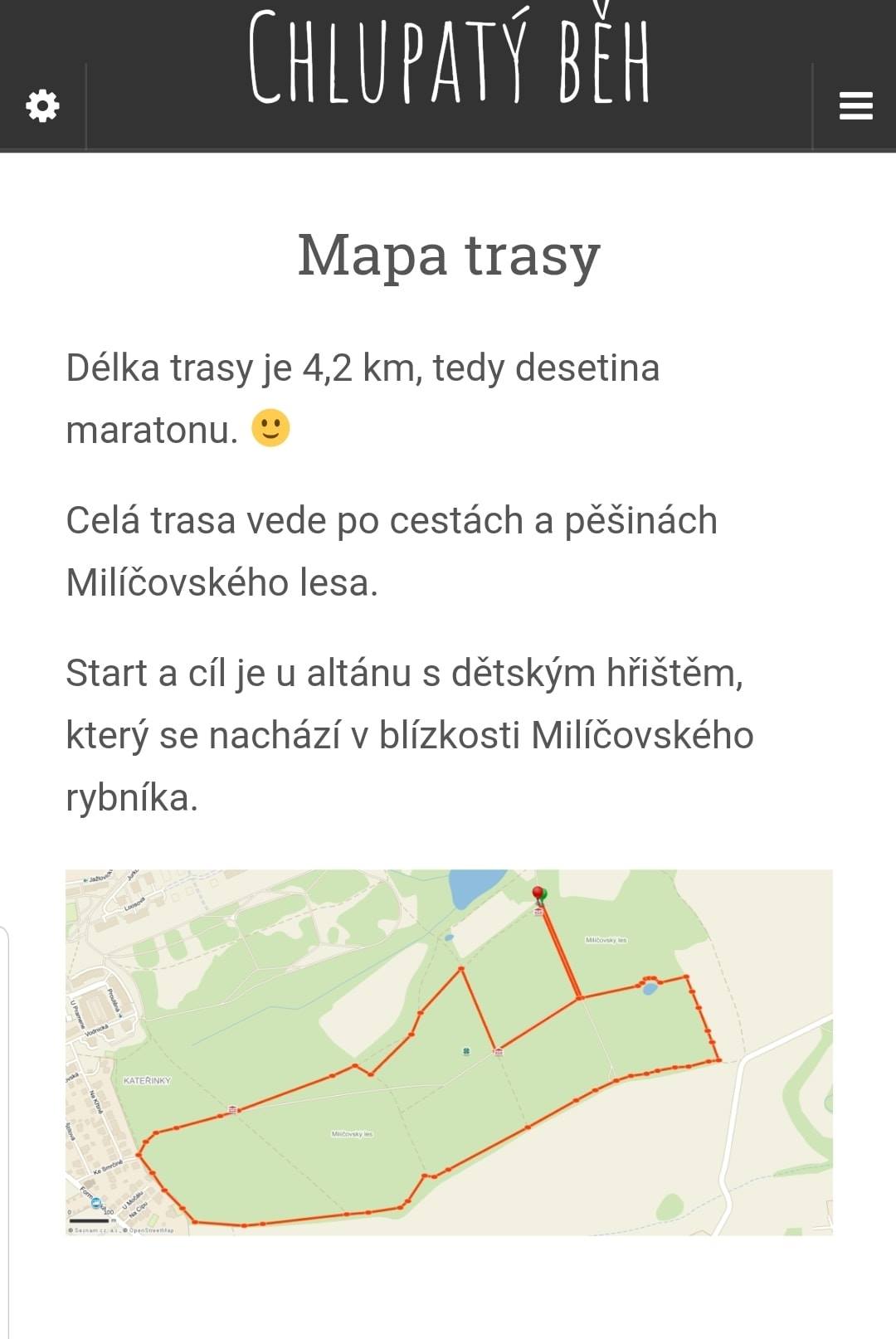 Trať měří 4,2 km, zaběhnete si tedy„decimaraton“. Celá trasa vede lesem po zpevněných cestách a pěšinách. Prohlédněte si, prosím, mapu trasy závodu. Trasa bude vyznačena barevnými fáborky a šipkami na křižovatkách. Trasa se před koncem závodu vrací zpět na širokou cestu, po které se vybíhá, takže do cíle budete dobíhat ze stejné strany, jako jste startovali.
