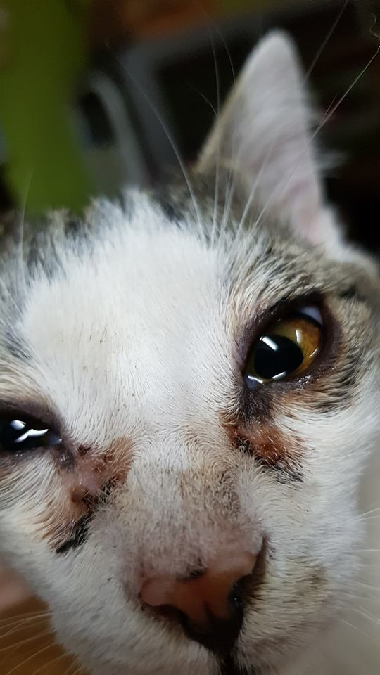 Zatím se léčí s rýmou a se zánětem v očích. Je ušmudlaný, má špatnou a řídkou srst.