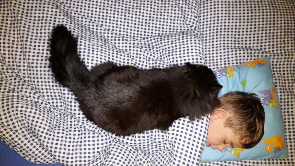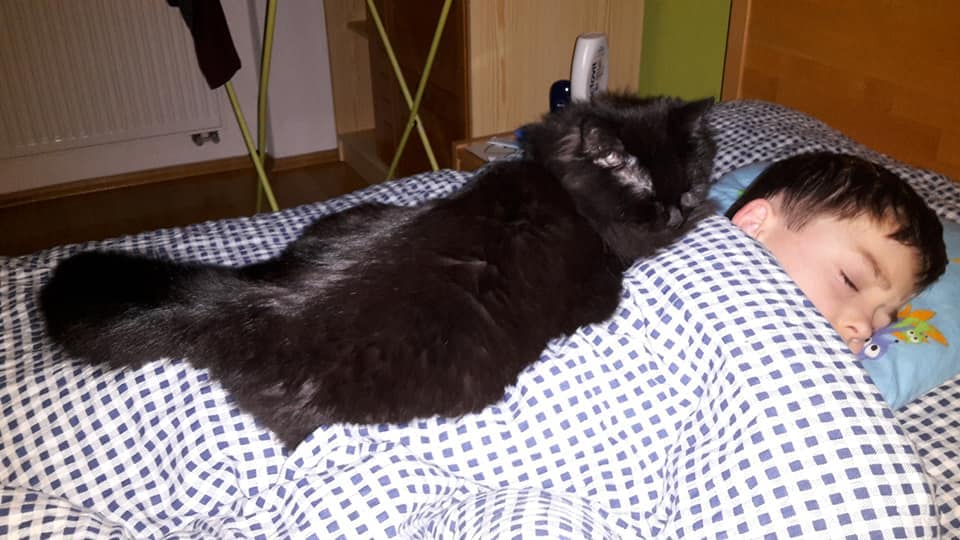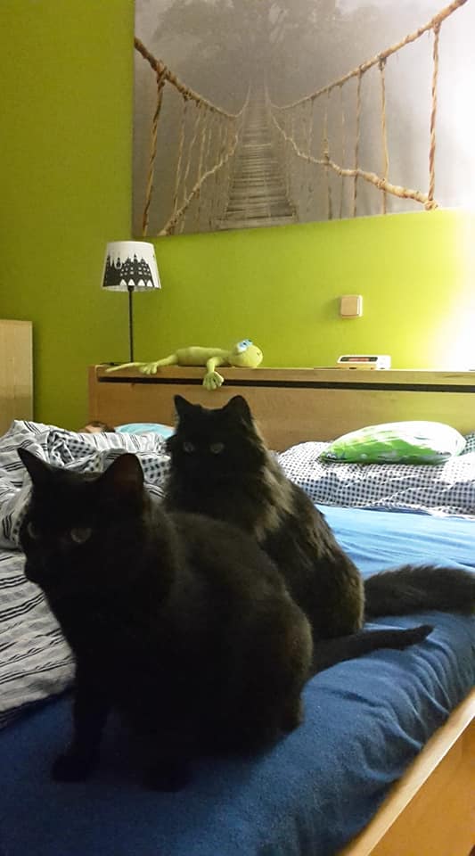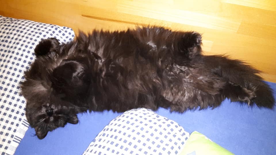 S Nhavou si už rozumí zase o kousíček lépe, takže noční honičky přes naše spící těla se skoky při jejich váze 5kg a 3kg na naše záda a břicho nejsou žádnou výjimkou. Sheva si díky svému zjevu chlupaté koule a pláclému čumáčku hraje někdy i na "dámu", ale pořád je to ztřešťené 1,5roční kotě