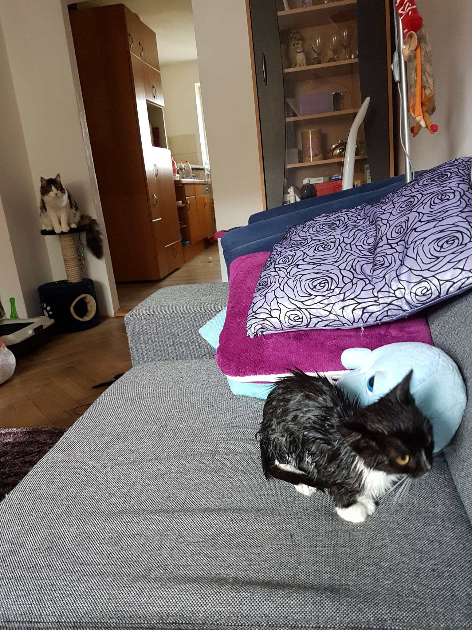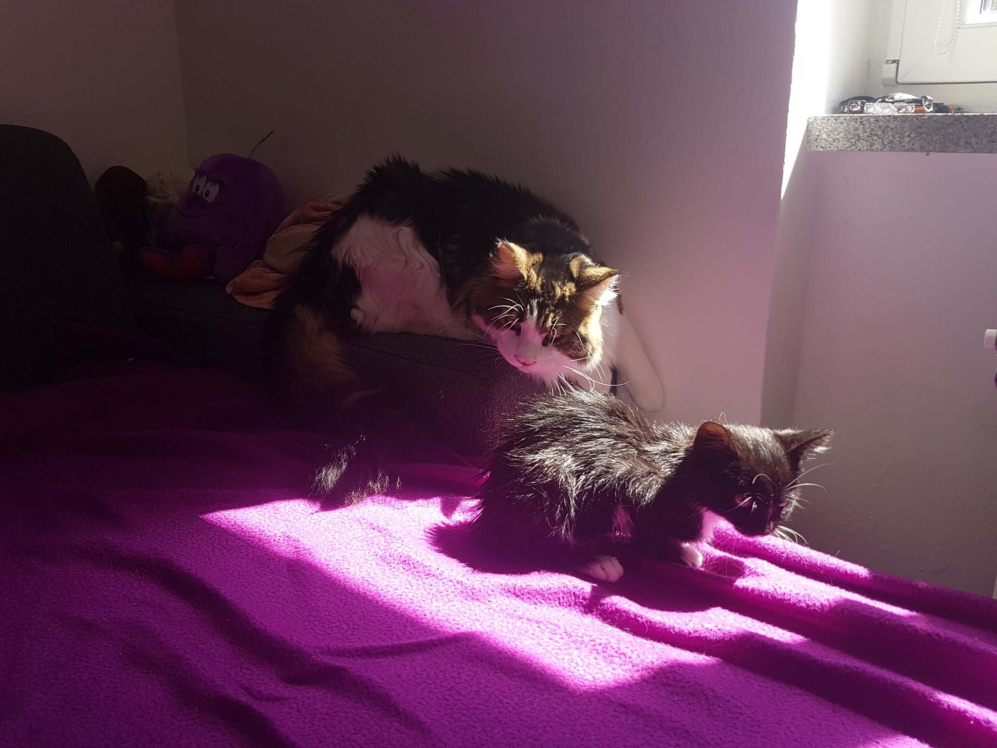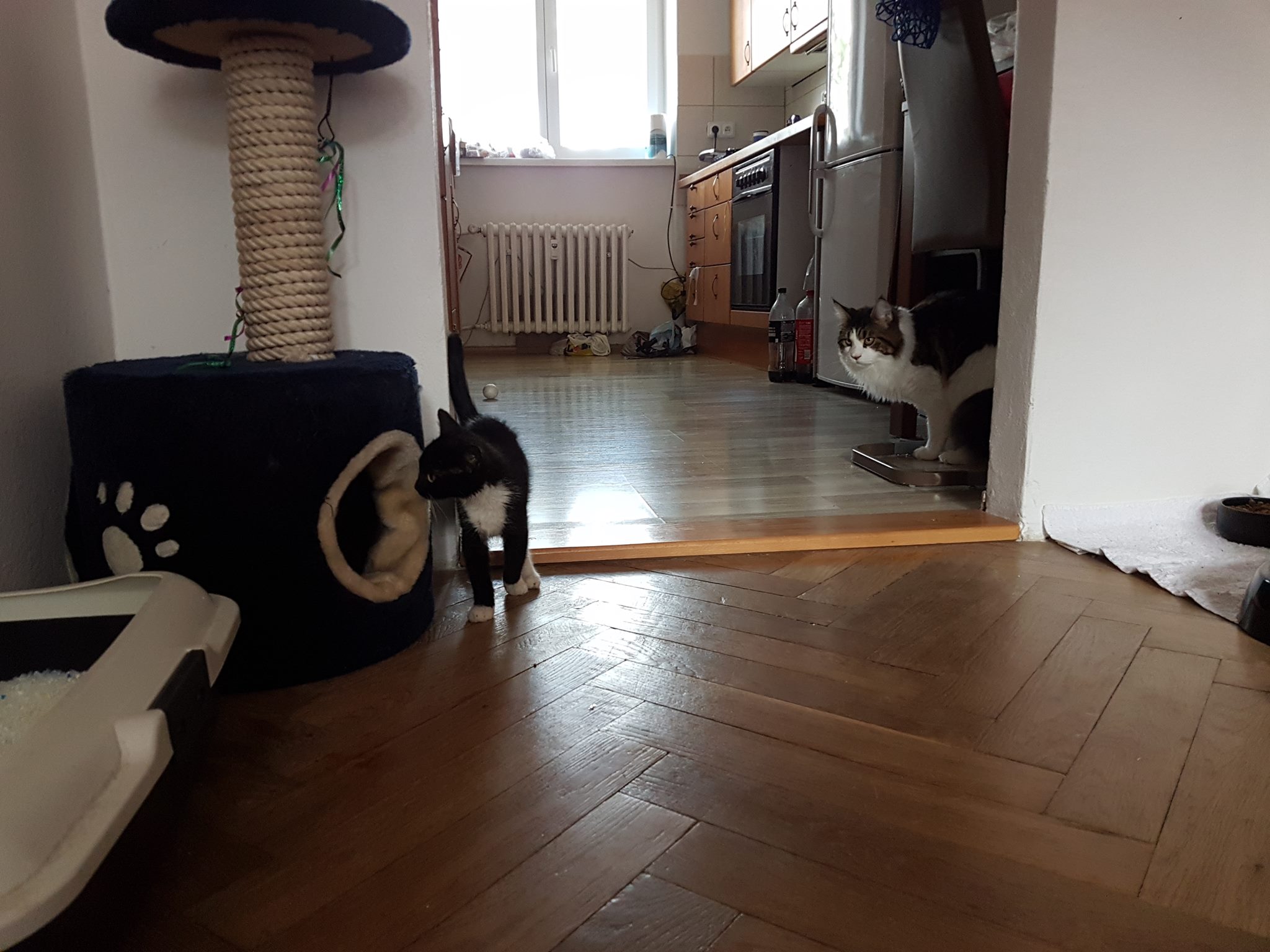 Dobry vecer, zasilam par fotek Skittlesnicky. Je to zlaticko, s nasi kocickou se seznamili celkem v klidu. Bohuzel ma ale Skittlesnicka prujem. Cestou zaneradila celou prepravku tak musela do vany a na veterinu, ale mela by byt v poradku. Budu davat prubezne info jak to s ni vypada.