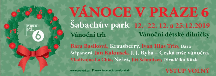 🔸 Program Vánoc v Praze 6 zahájí 12. prosince v 17.00 hodin Adventním koncertem Ústřední hudba AČR. V dalších dnech se můžete těšit např. na Báru Basikovou, Ivan Hlas trio, Jana Kalouska, Vladivojnu La Chiu, Neřež či Jiřího Schmitzera. Nezapomínáme ani na děti, s hudební pohádkou přijede opět třeba Divadélko Kůzle a vánoční pozdrav chystá Spejbl s Hurvínkem. Zajít si můžete taky na oblíbené vánoční dětské dílničky, od 14. do 22. 12., vždy od 16.00 hod.