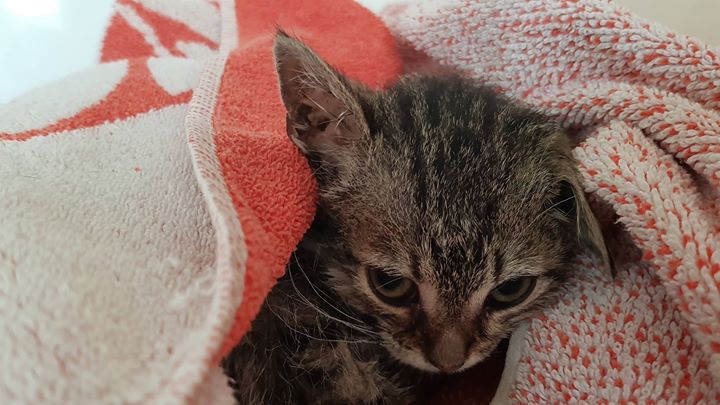 Přijali jsme apatické, mourovaté kotě. Bylo nalezeno v parku v obci Bříza. Při nálezu tělíčko mrněte bylo poseto masařkami, které na kotě kladly vajíčka. V kožíšku po celém těle se to hemžilo blechami. Příšerný pohled. Kocourek musí být anemický, jak ho vysávaly. Blechy chlapečka musely příšerně trápit. Mrňous byl tak apatický, že si nechal všechno líbit a vůbec se nebránil. Po důkladném ošetření, zabalený v osušce, vyčerpaný usnul.