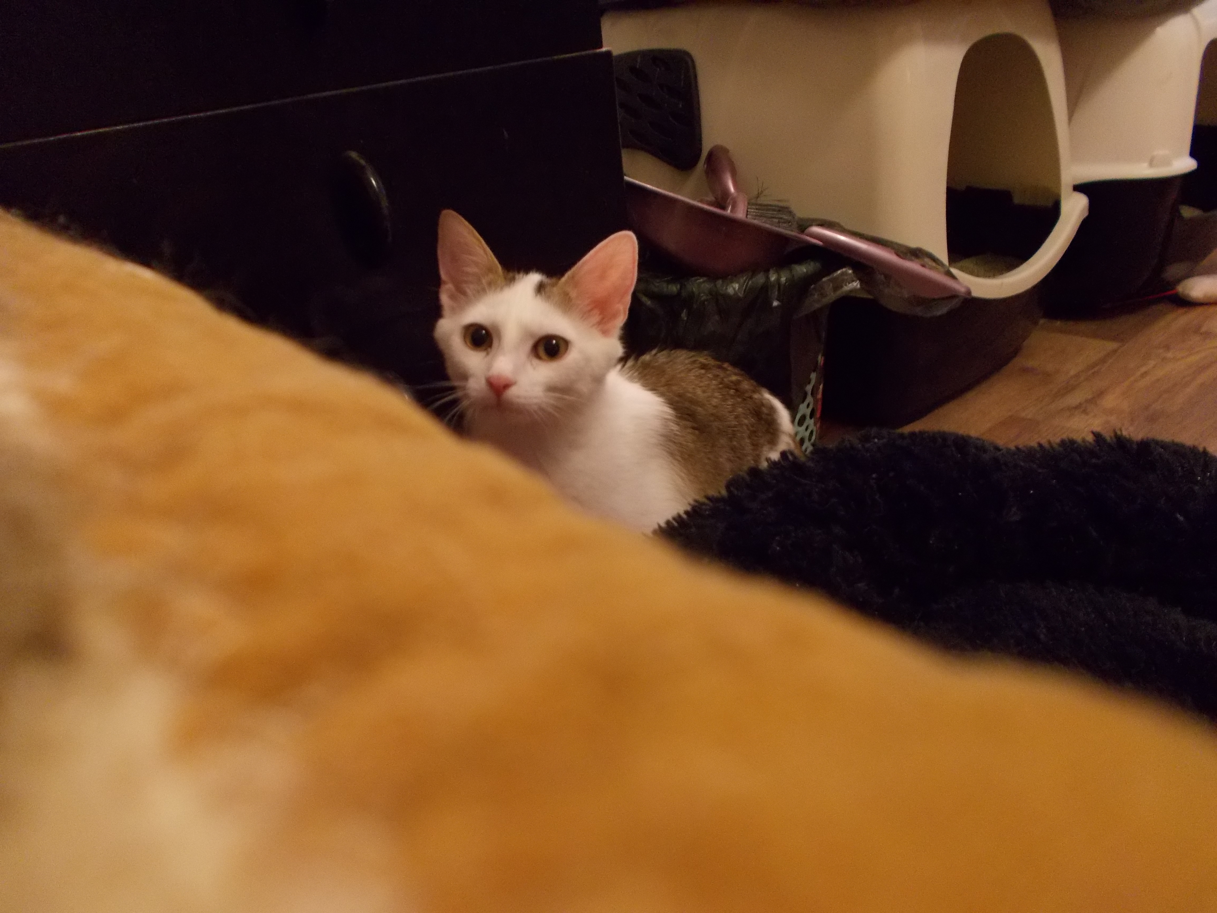 Bílomourovatá kočička z poslední várky zachráněných koťátek z končící farmy v Bohušovicích. Je to taková malá komediantka. Chvíli se nezastaví, vůbec nevím jestli chodí spát. Je ji všude plno. Sní co najde. Ochutná i sladké, nejraději má ale mlíčko a tvaroh a Pribiňáka. Jako další dobrůtku má syrové maso. O jídlo se sama hlásí. Je to mazlivá, roztomilá rošťanda.
