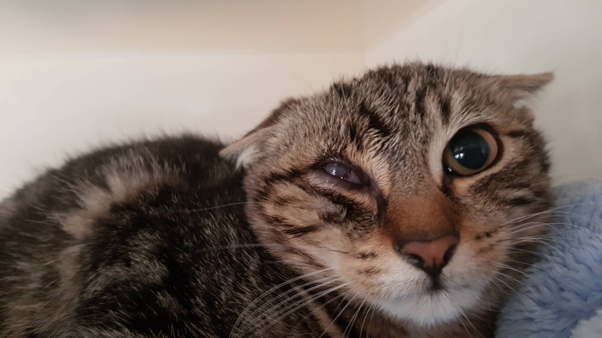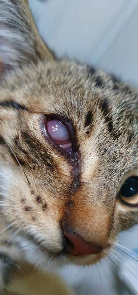 🔸Její odchycení chlapeček Strašpytlíček s rozsáhlým vředem na pravém očičku si pomalu u nás zvyká, trošku se ještě před rukou krčí, ale nijak neútočí. 🔸Jeho očičko se hodně pomaloučku lepší, tedy vřed se zmenšuje. Nelze očičko moc vyfotit, zavírá ho.