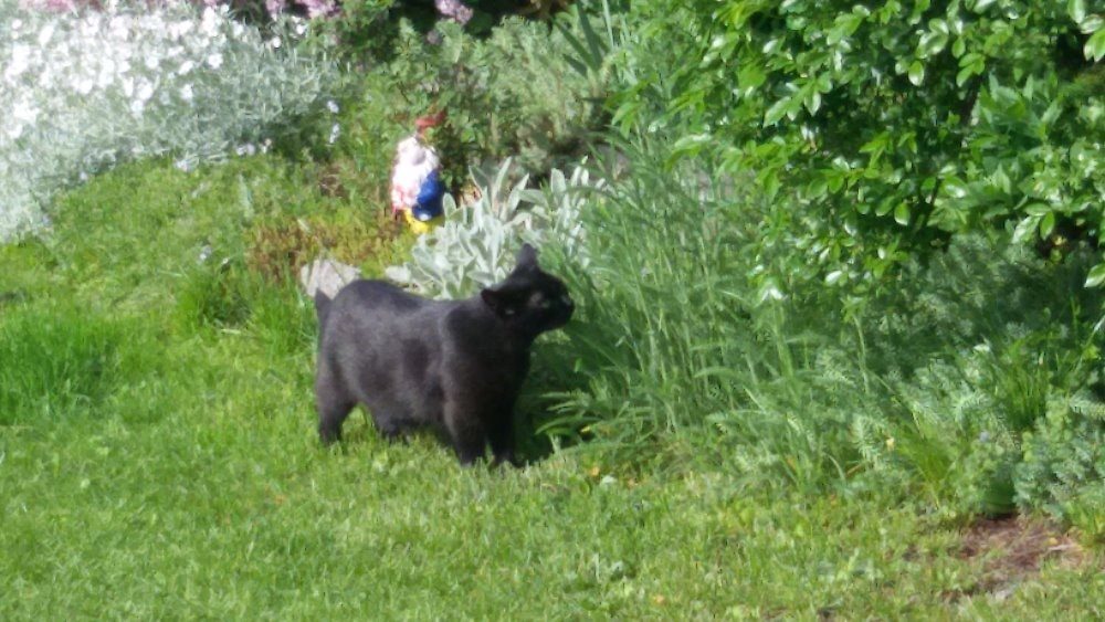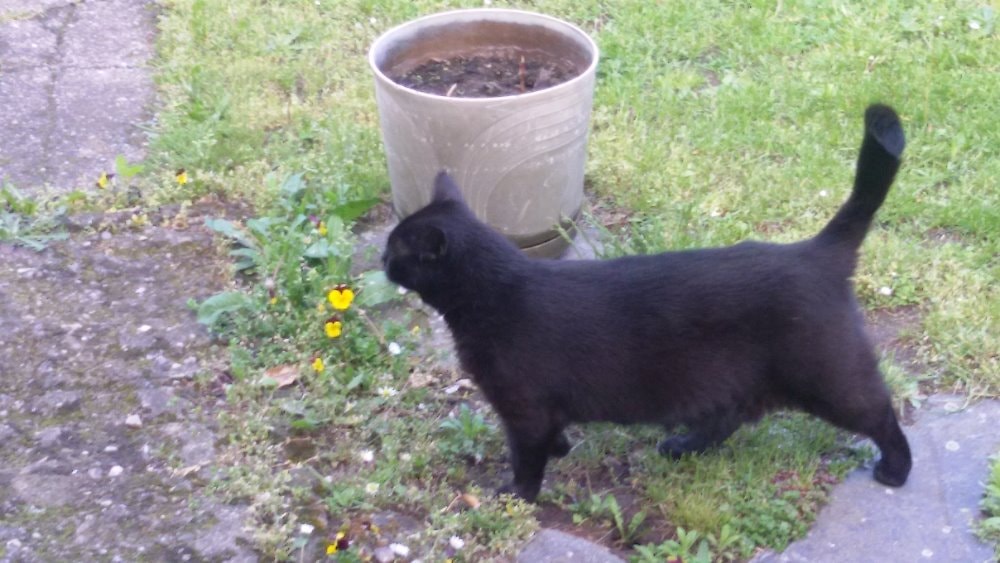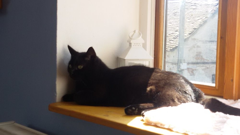 Do soboty 18. jsem jí držela doma, aby si zvykla vůbec na velikost baráčku a v sobotu jsem jí poprvé vypustila na zahradu. Předtím jsem prkny zakryla možnosti úniku pod plotem a vraty, protože jsem se obávala, aby se hnedka nevydala na potulku. Bylo velké prozkoumávání. Obešla celou zahradu po obvodu, pak jí přeběhla několikrát napříč a potom jsem jí raději zase vzala domů. Včera, v neděli byla venku celé dopoledne. Všechno dobré, ale zjistila, že když vyskočí na zeď, tak vidí ven a tam je to teprve rozhled a prostor.Dneska byla zase půlhodiny venku a samozřejmě vyskočila na zeď a koukala ven (kdyby tam nebyly z druhé strany keře, tak už je dole), taky viděla v dálce kočku na zahradě u sousedů……….