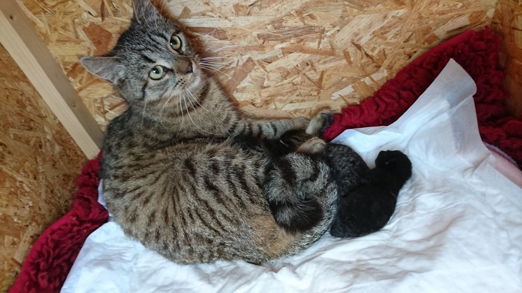 Náš nový přírůstek, mourovatá maminka se čtyřmi koťátky – černá holčička, černý a dva mourovatí kluci (tedy alespoň myslím). Koťátka se narodila 2.5.2017 v Roudnici n.L. u holobytů, kde máme kolonii vykastrovaných 21 kočiček. Jedna kočička byla špatně vykastrována, rodila nadále koťátka až do loňského podzimu, kdy se jí konečně i s koťátky podařilo odchytit a kastraci opravit. Loňská, jarní koťátka se nám však nepodařilo najít a tahle maminka je jedním z nich. Ještě je tam její bratříček. Měli jsme veliké štěstí, že kočička porodila do polystyrénové boudičky a byla u koťátek zatím úplně pořád. Paní, která kočičky krmí to zjistila a povedlo se kočičku i koťátky dopravit do Sluníčka. Hodně jsem si oddychla, neboť by se nám tato velká kočičí lokalita rozmnožila. Není vůbec jednoduché chytit do sklopce tu správnou kočičku, když je jich tam takové množství. Je to téměř nemožné a stojí to spoustu času a benzínu. Tak snad už se nám zde žádná koťátka do budoucna neobjeví.