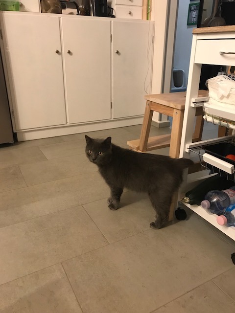 Má se tady dobře a jsme kamarádi, už zase sedí za mnou na židli u počítače. Po výškách zatím neleze, vyskočí na škrabadlo a na pračku do koše s prádlem na žehlení.