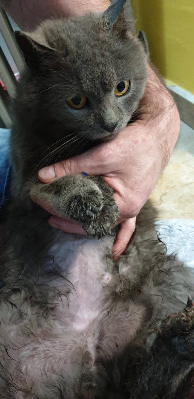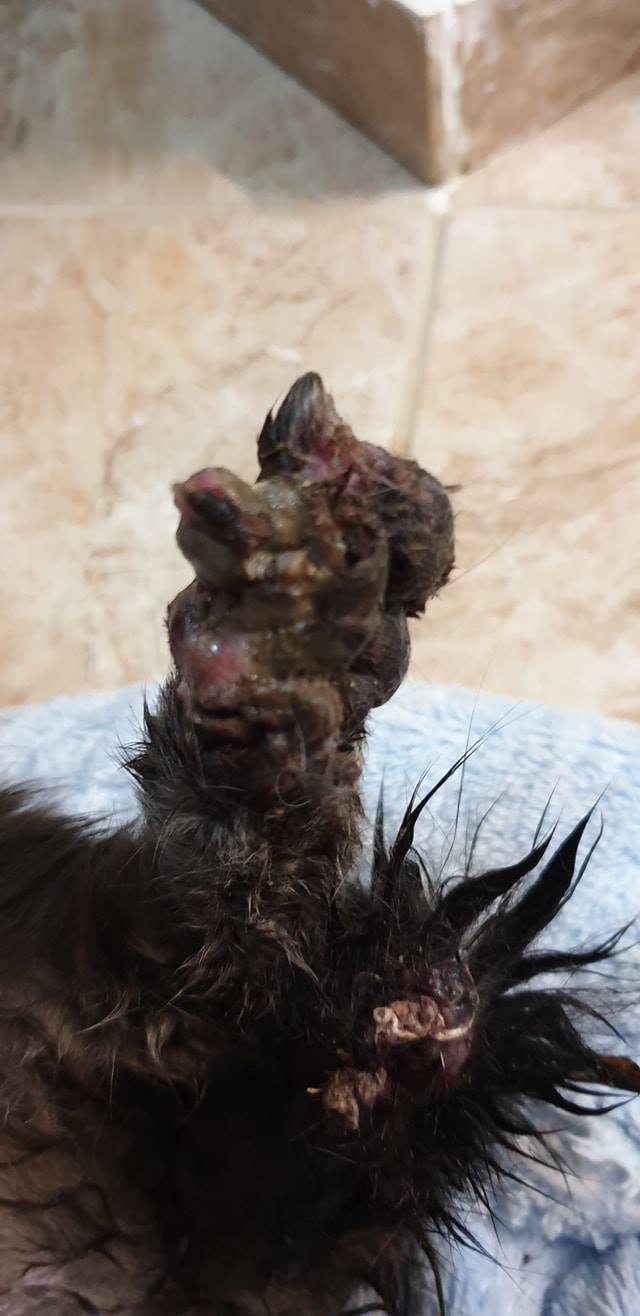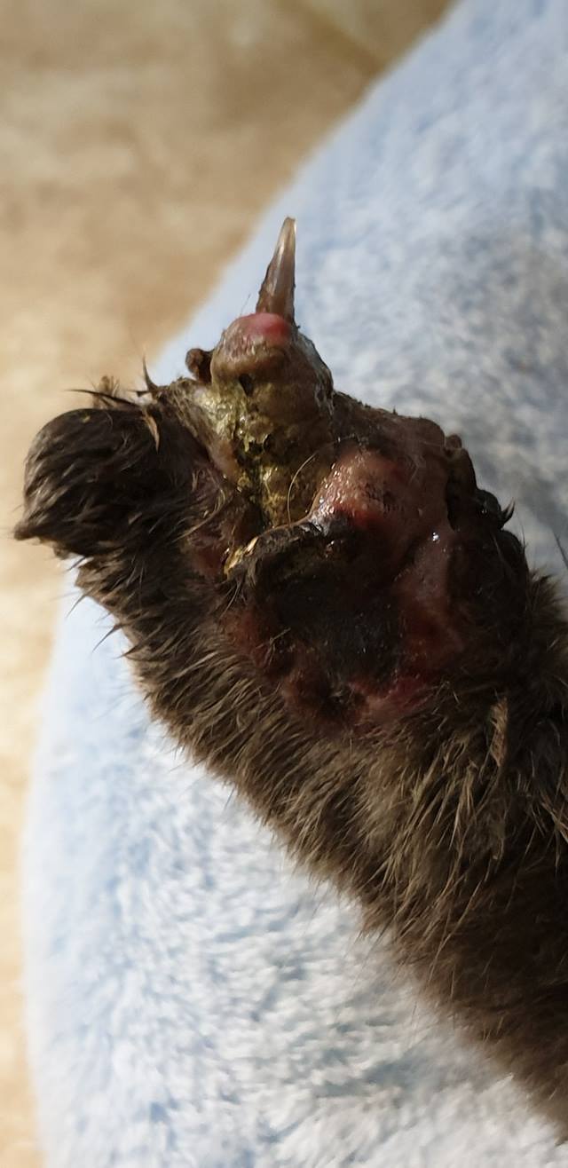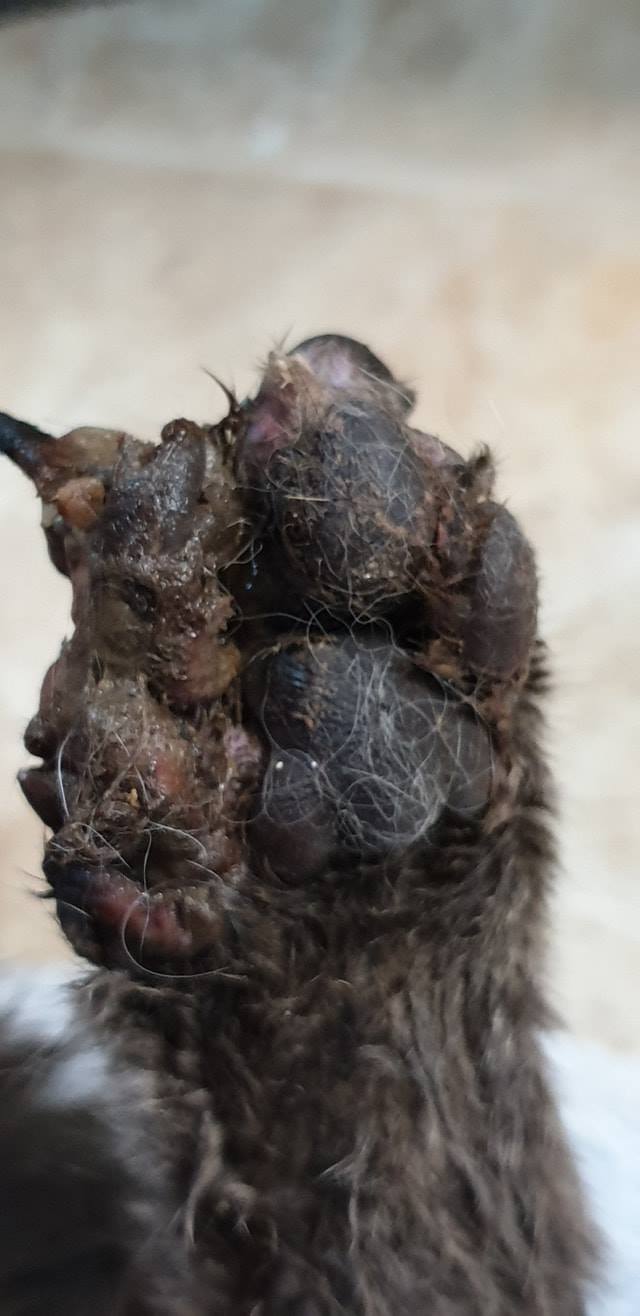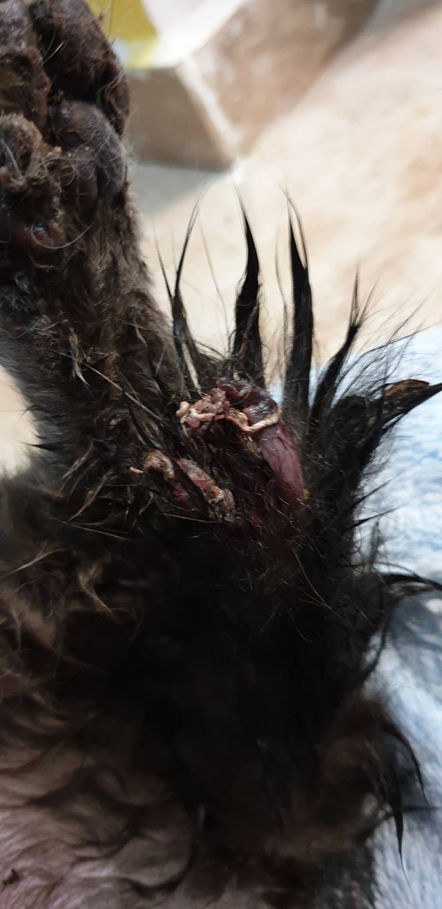 🔸Obě zranění jsou staršího data. Z ocasku trčí seschle cévy a šlachy, rána na tlapce hnije. Uvidíme zda se tlapka podaří zachránit. Kocourek musel několik dní, spíše týden neskutečně trpět❗Je však moc milý, také se nám nelíbí jeho velmi zkalena moč. Dnes jedeme na kliniku.