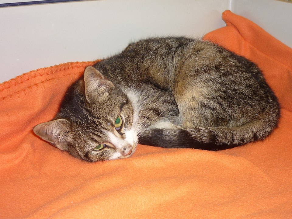 Nový přírůstek do Sluníčka – asi půlroční kocourek Kristiánek, velmi hubený, špinavý, svrab v ouškách, od narození se asi nikdo o něho nestaral – nechtěné kotě.