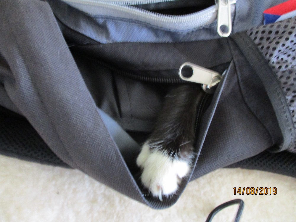 Nejraději spí v křesle a na mikrovlnce a packa prozrazuje, že se schoval v batohu.