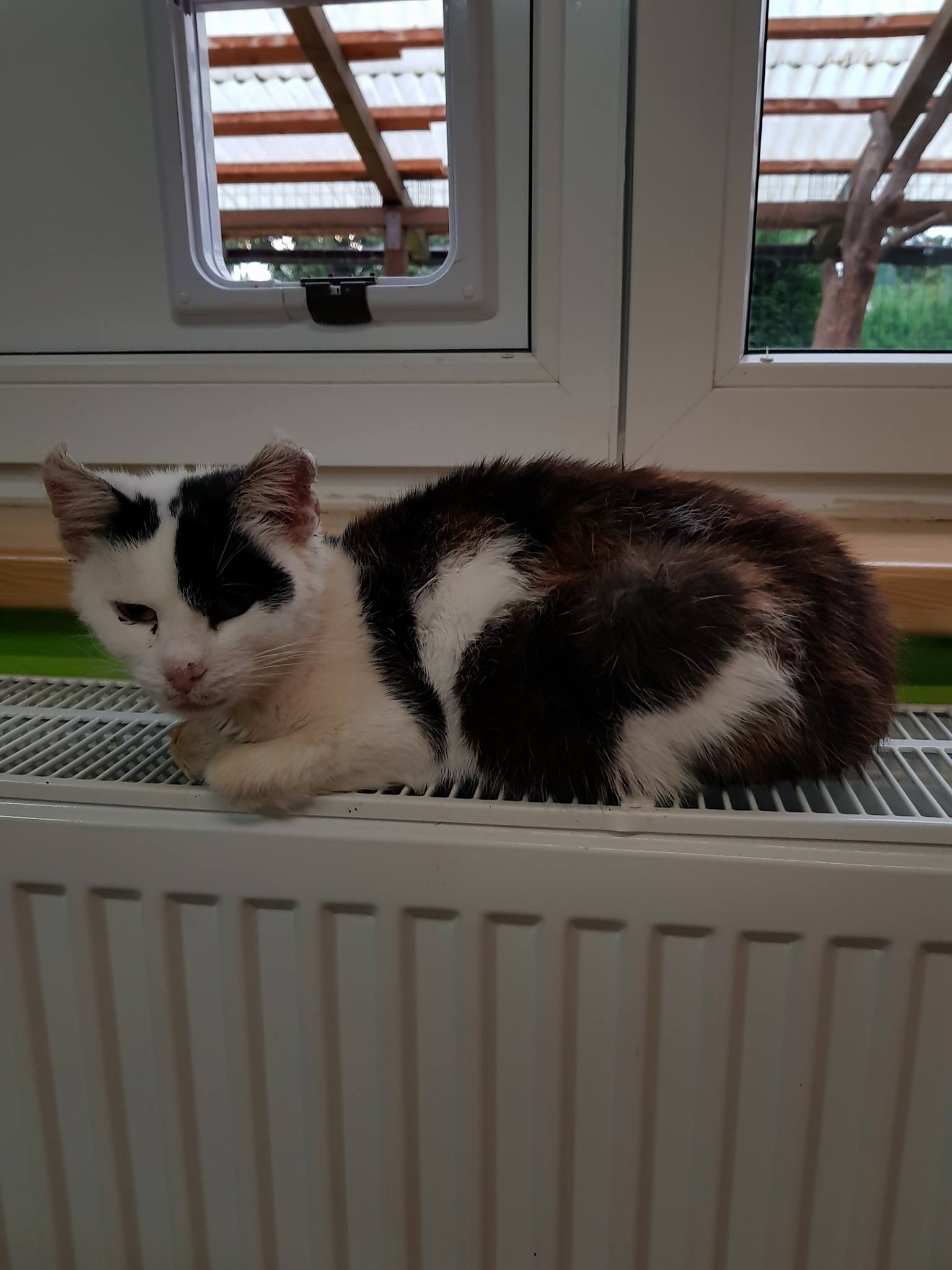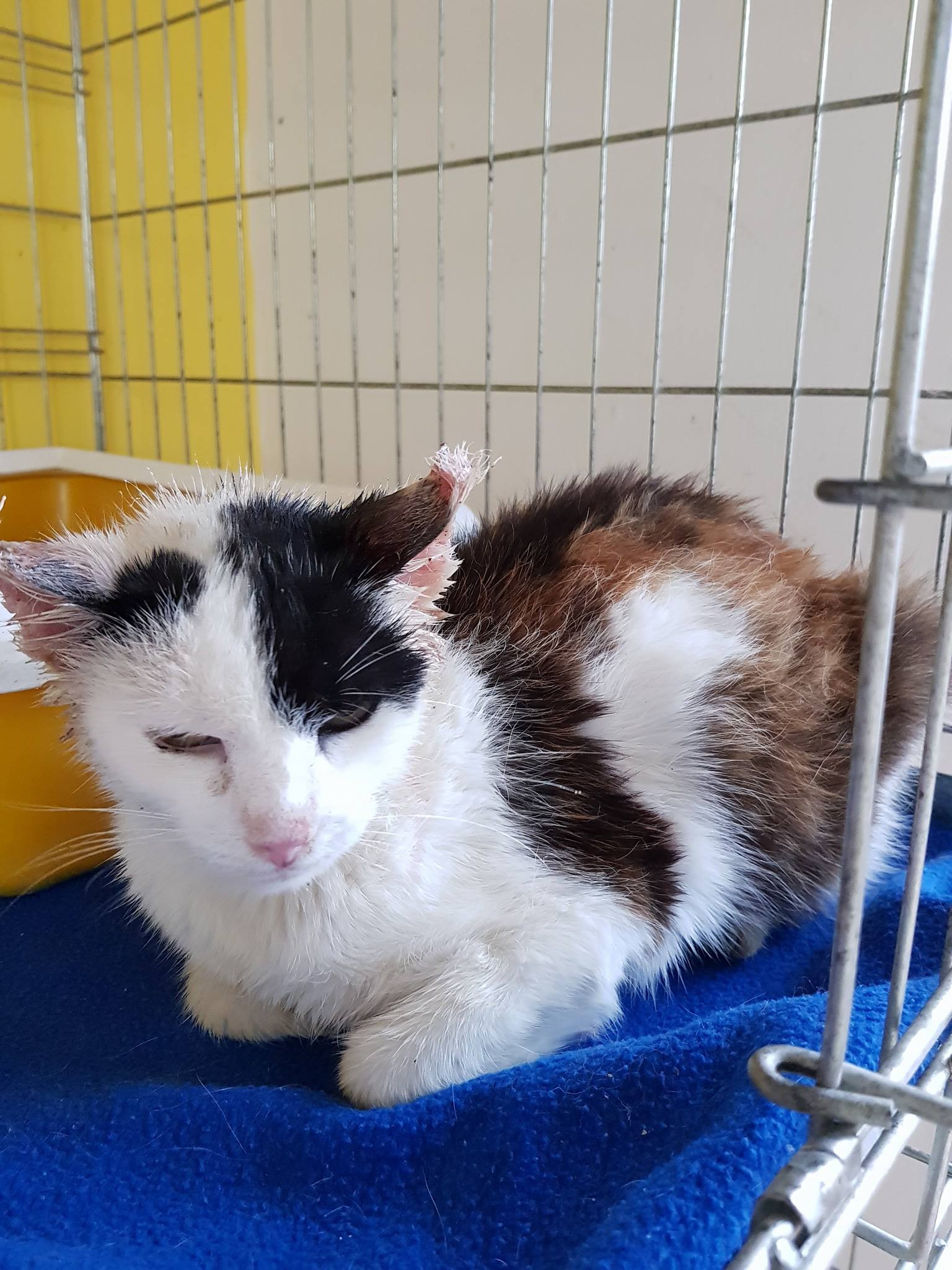 Černobílá kočička, kterou přivezla jedna slečna z obce Vrbice. Byla zubožená, pravděpodobně březí, s ošklivým zánětem v ouškách. V ouškách měla veliké špunty jako kdyby ji někdo nakapal do uší vosk. Zánět zasáhl i ušní boltce.