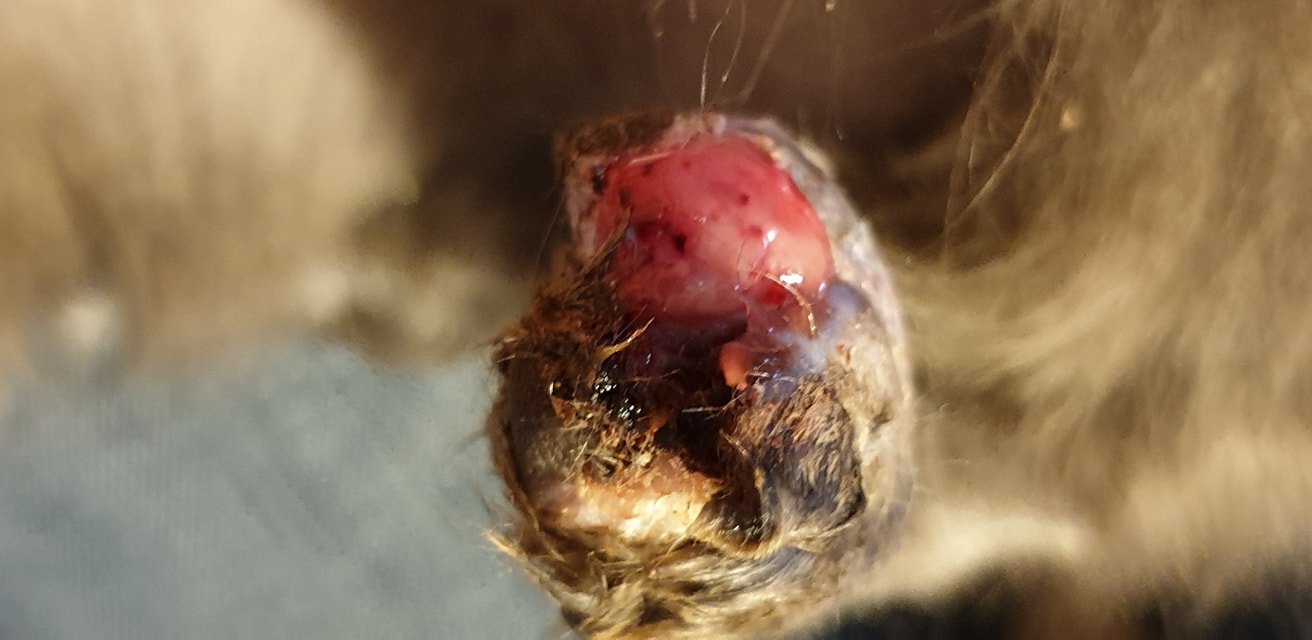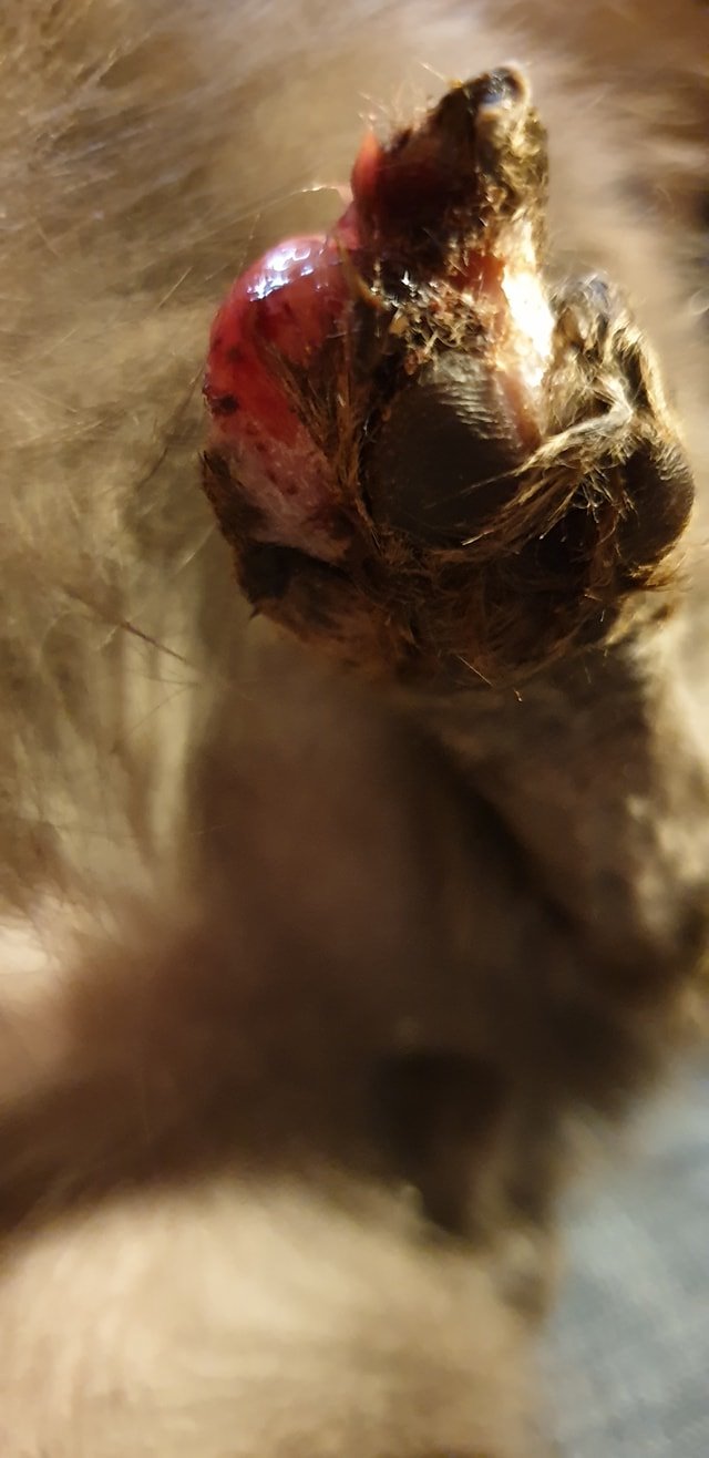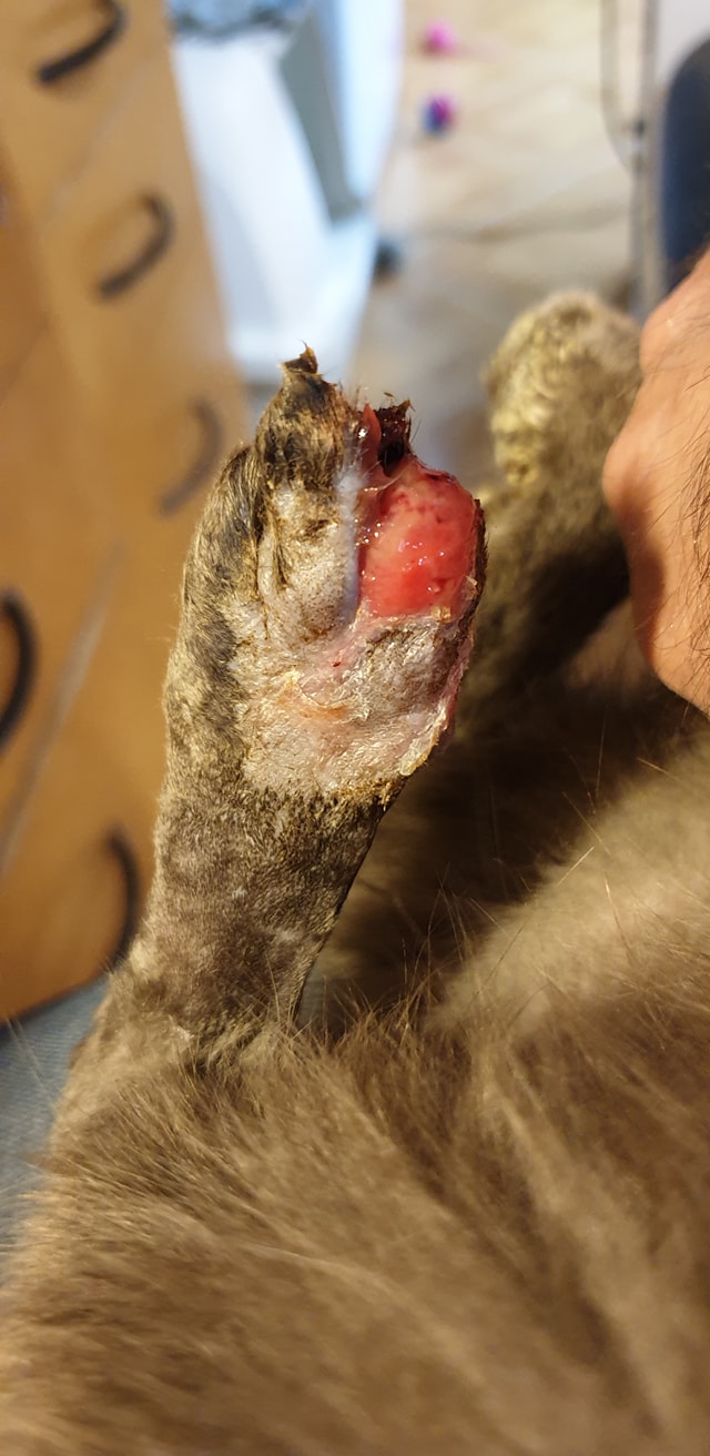 🔸 Po odstranění nekroticke tkáně, poškozených prstiků, polamanych kostiček, neustálém převazovaní, omývání koloidním stříbrem, "patláním" specielni medovou masti….. .. se rána krásně zklidnila a tlapka vypadá skvěle.