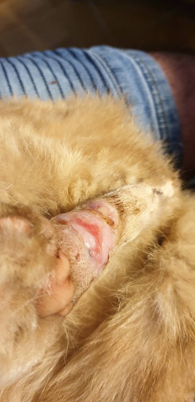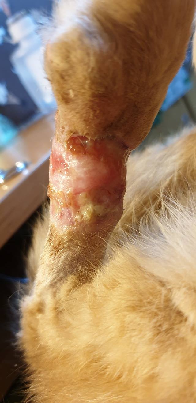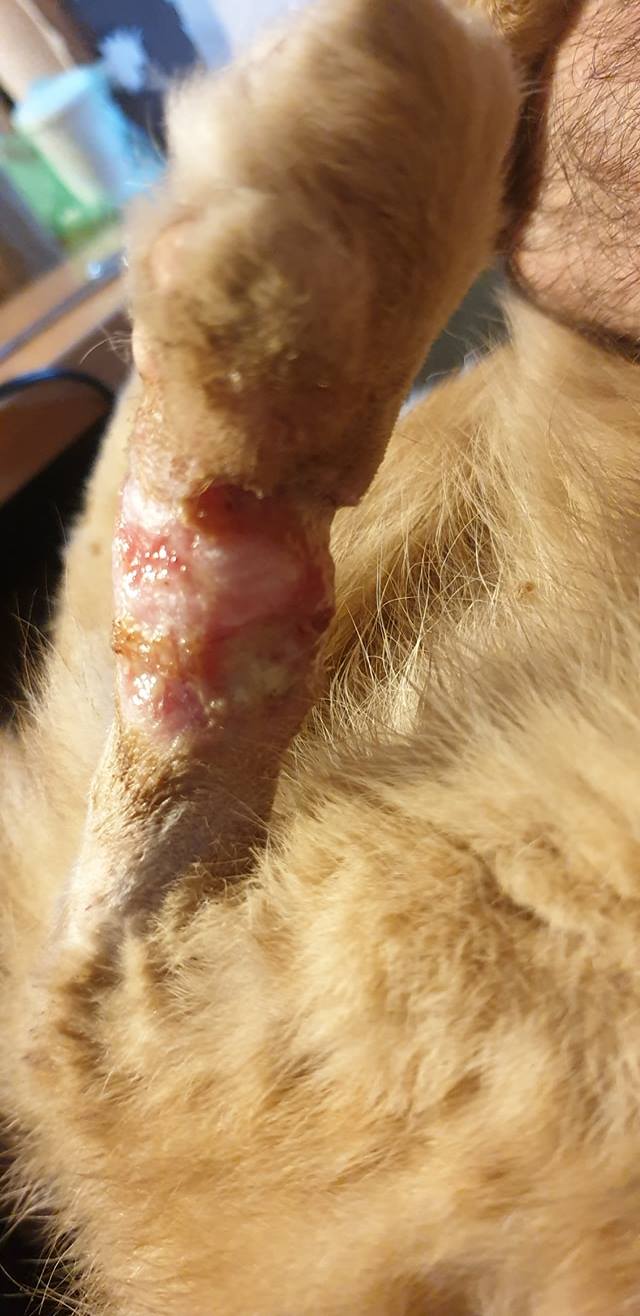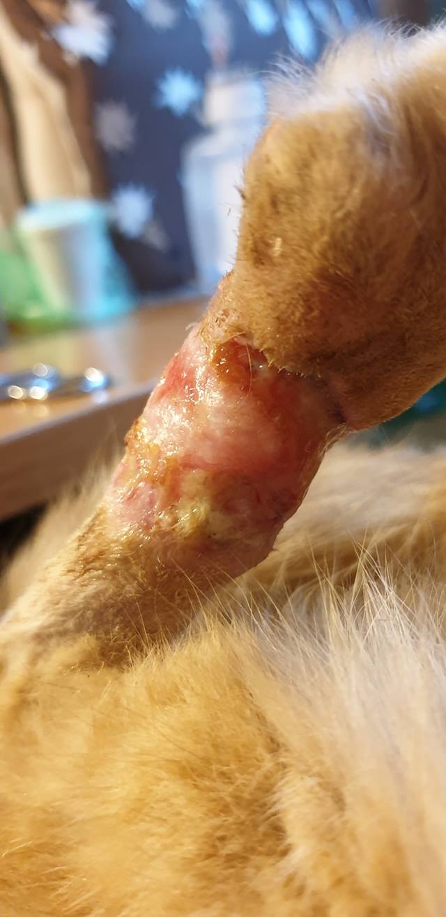 🔸 Tenhle úžasný zrzavý klučík stále bojuje o nožičku. Rána ač už pěkně zacelena, musela být reoperována. Bylo potřeba uvolnit tkáň aby cévy mohly vyživovat zbytek tlapky a ta neotékala.🔸Teď se tedy vracíme opět na začátek a znovu každý den prevazujeme. Pacient je to ovšem úžasný, trpělivý.