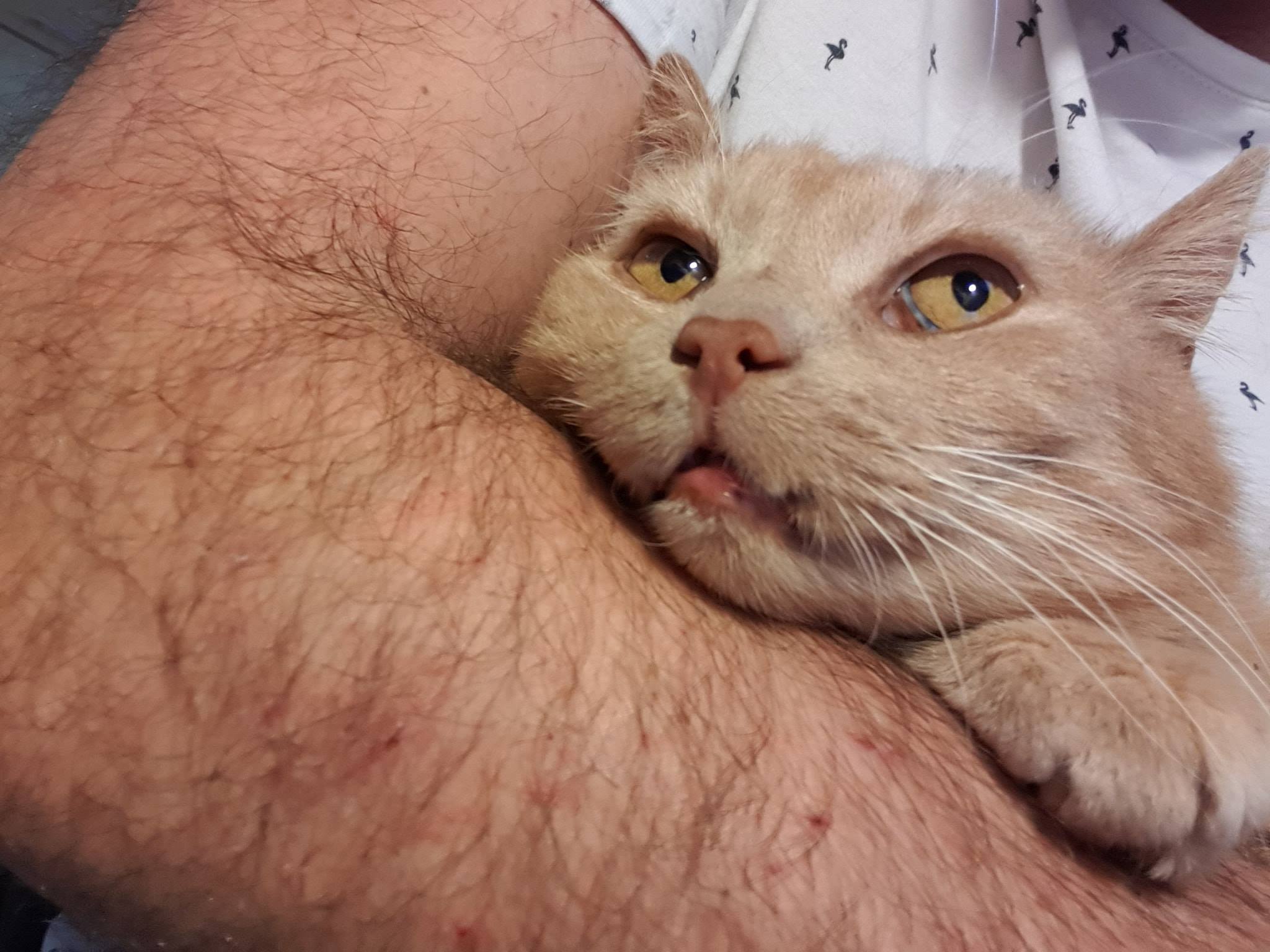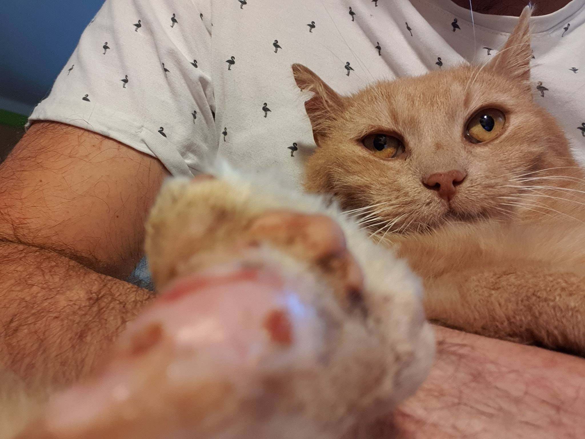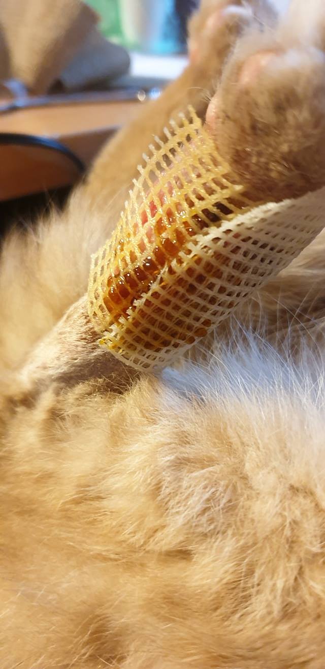 🔸 Tenhle úžasný zrzavý klučík stále bojuje o nožičku. Rána ač už pěkně zacelena, musela být reoperována. Bylo potřeba uvolnit tkáň aby cévy mohly vyživovat zbytek tlapky a ta neotékala.🔸Teď se tedy vracíme opět na začátek a znovu každý den prevazujeme. Pacient je to ovšem úžasný, trpělivý.