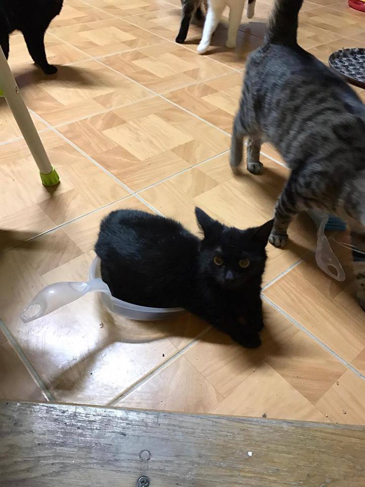 Kočička po kastraci, pravděpodobně sestra Smolíčka, bude vrácena do sběrného dvora, je hodně plachá.