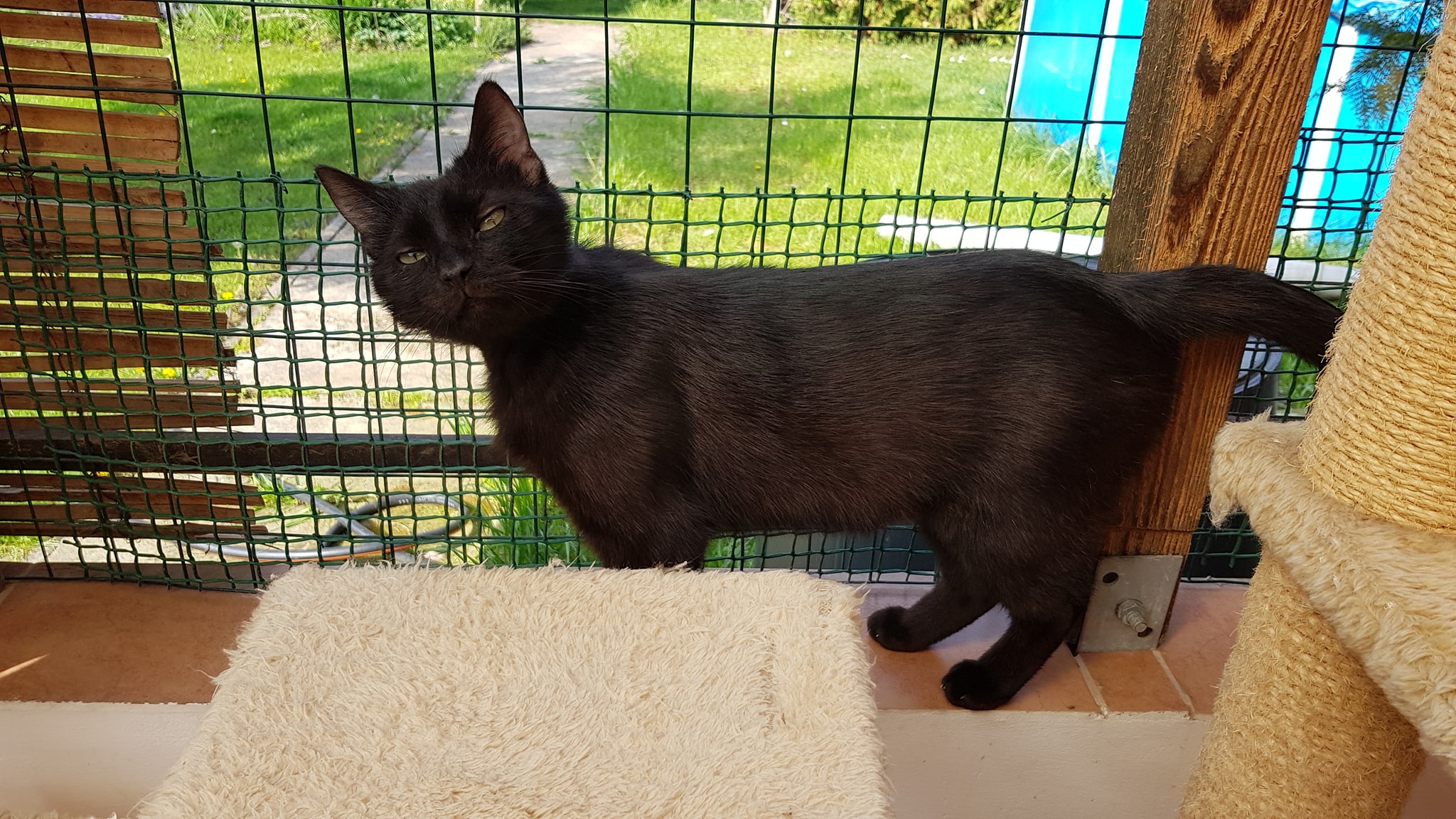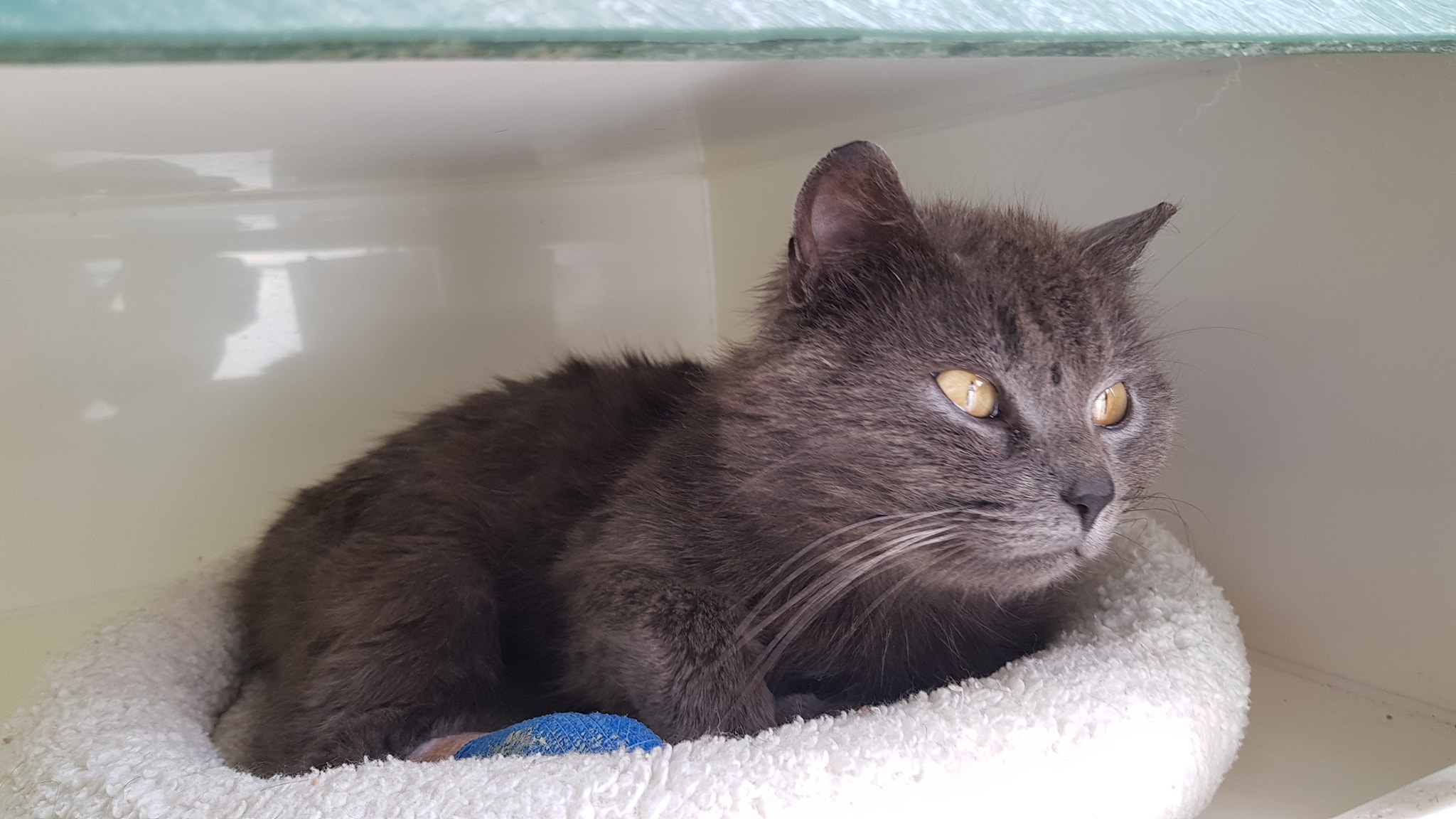 Modrá kočička Mili je pořád ve voliéře. Bojí se prudkého pohybu, stále se pohybuje pouze po zemi. Ohledně jejího řádného neurologického vyšetření čekáme, zda nabyde více důvěry a budeme moci s ní manipulovat. Epileptický záchvat jsme zatím buď nezaznamenali nebo ji žádný nepostihl. Kromě toho, že po nás seká, se jí zřejmě daří dobře, rozrůstá se nám do šířky.