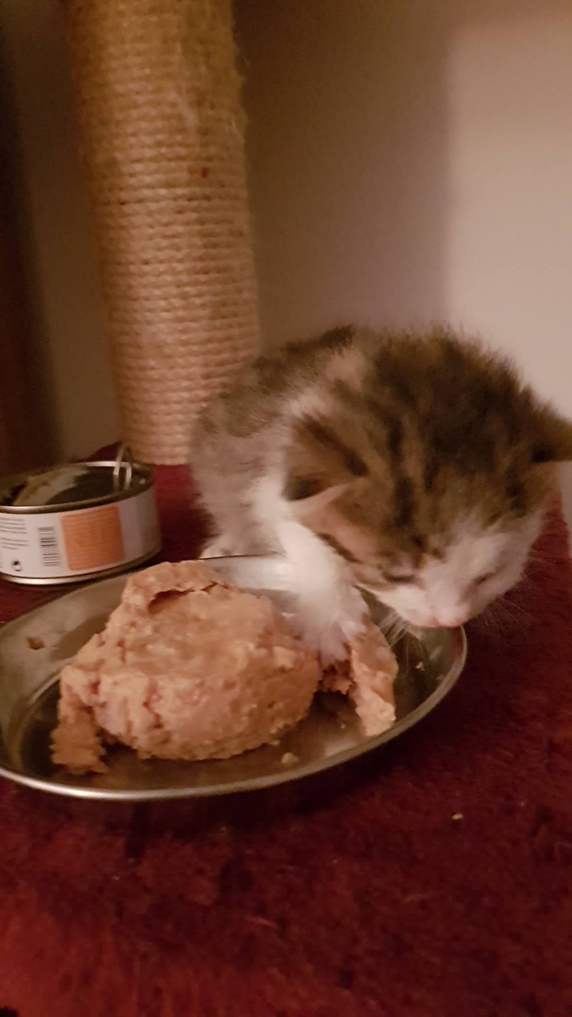Ve čtvrtek jsme přijali malé bílomourovaté kotě, necelé čtyři týdny staré. Bylo nalezeno v Charvatcích ve stodole s ještě dalšími dvěma sourozenci, kteří byli již mrtví. Naše koťátko se odplazilo na zahradu, hledalo maminku, ale ta nepřicházela. Majitelka pozemku, která koťátka našla, se celou noc o přeživšího chlapečka starala. Neměla nic jiného než kravské mléko. Malý má hodně nafouklé bříško a průjem. Trochu baští i konzervu. Snad se nám podaří jeho trávicí trakt dát do pořádku. Maličký dostal jméno Zahradníček.