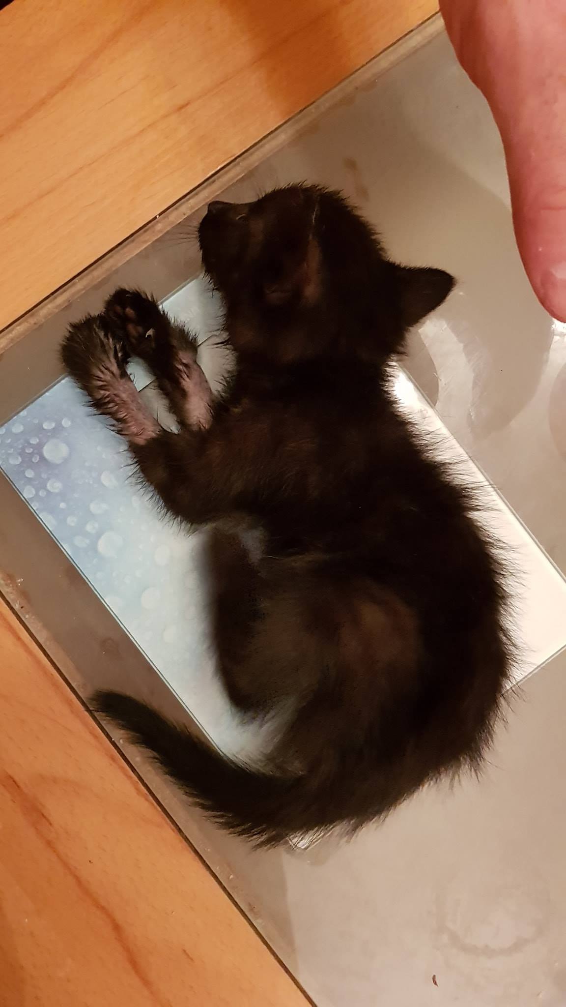 Ve stejný den večer přišlo další koťátko od pískovny v Dobříni za plynárnou. Leželo u vrat zahrádky, je hodně apatické, teplota nešla naměřit, váží 280 gramů, je mu tak kolem pěti týdnů. Odhaduji, že je to bratříček Vaja. Jsou stejně velcí a oba černí. Okamžitě se rozjela akce o jeho záchranu. Maličký trochu lízal konzervu, byl však po každém soustu hodně unavený. Tělíčko jsme se hned snažili zahřát. Michal zburcoval paní doktorku k zavedení kanyly, aby ho bylo možné zavodnit infuzí. Kanyla se však zavést nepovedla. Michal malého pomaloučku krmil stříkačkou. Teplota se podařila naměřit, měl 33 st. C. Nyní ještě bojujeme, snědl sám trochu konzervy, ale nevím, nevím, je studený i přes zahřívání. Jméno malý ještě nemá.
