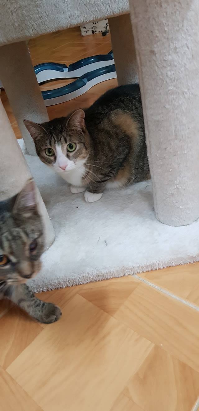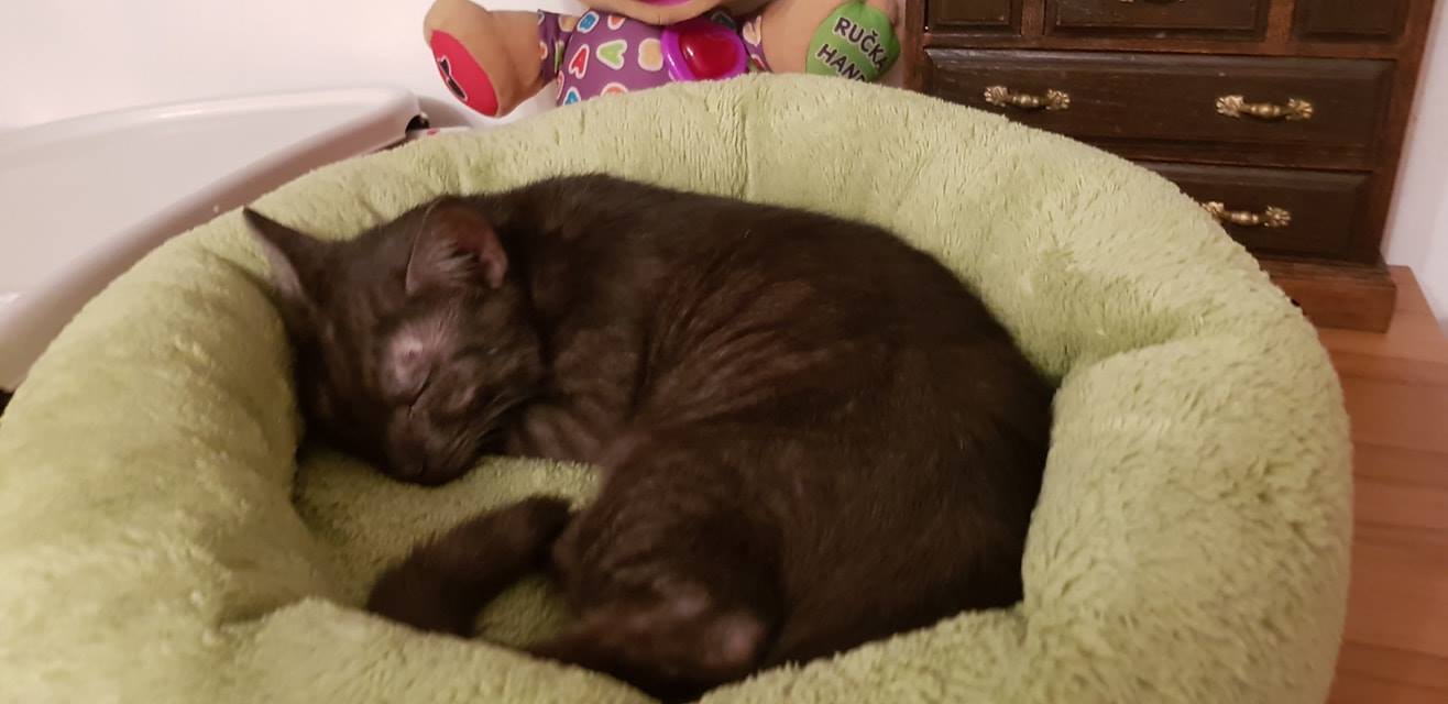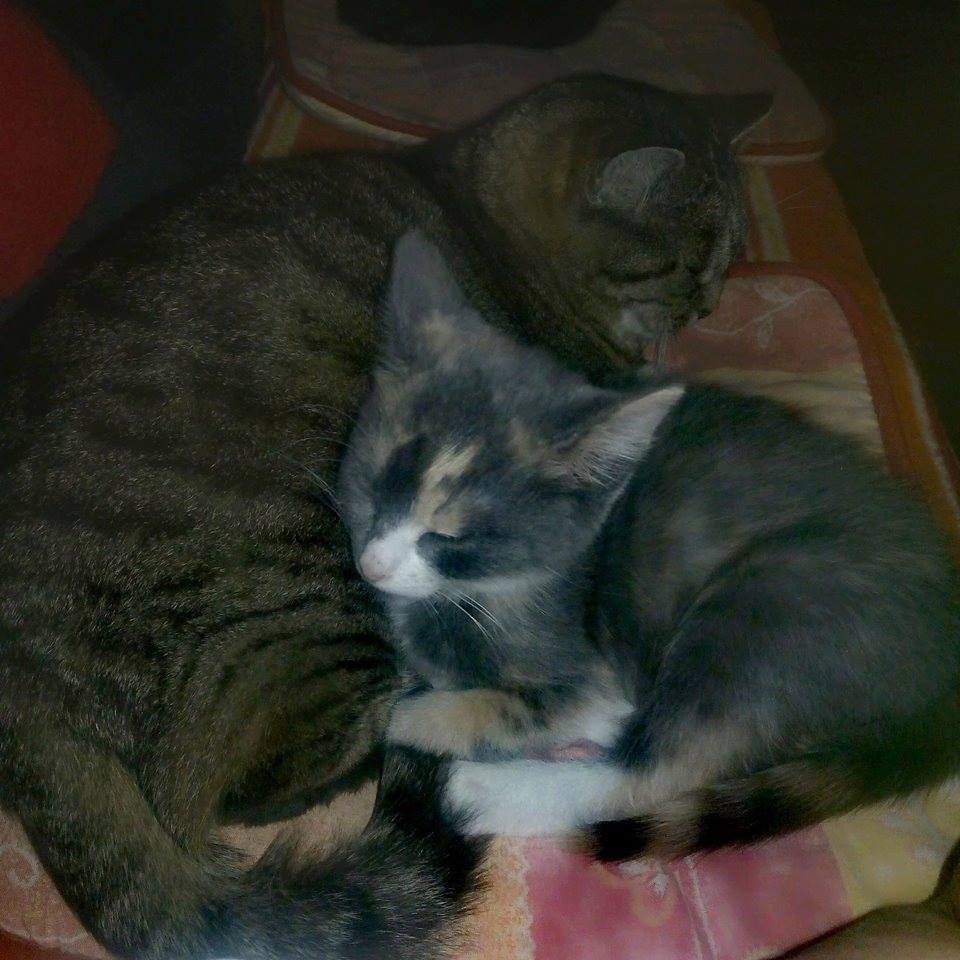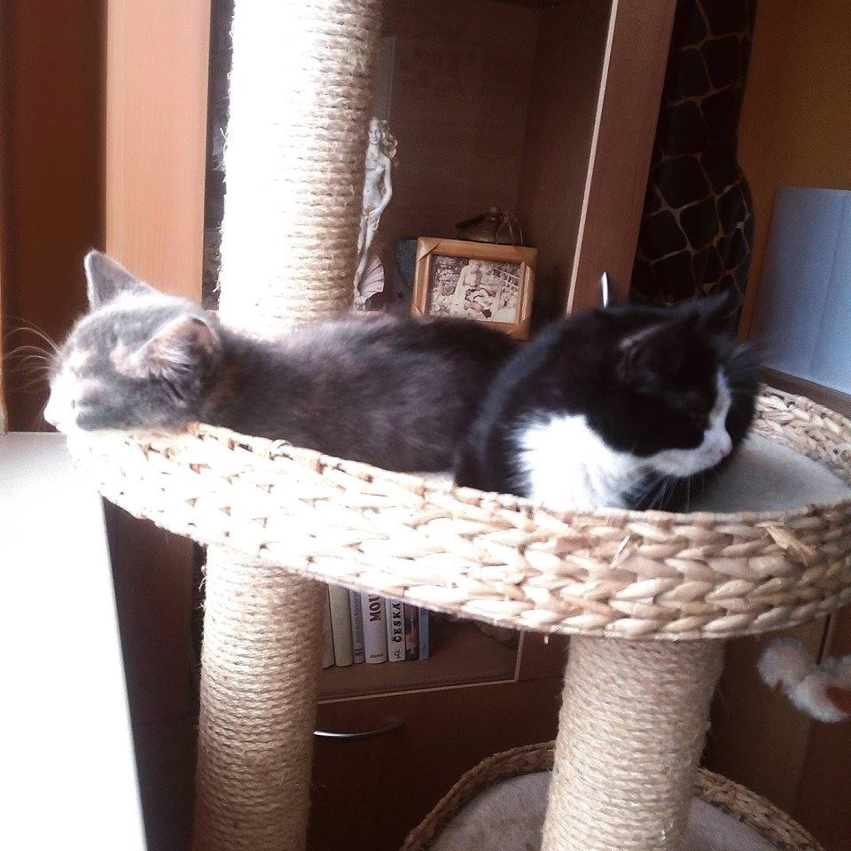 Koťata Meda a Kaira byla přijata z důvodu špatného zacházení v domově, kde bydlely holčičky po té, co je zachránila paní, která je našla i s jejich maminkou v jedné obci. Koťátka byla maličká s vystupující páteří. Z důvodu karantény v útulku, byly Meda s Kairou umístěny do depozita u Jitky. Jsou tam již druhý týden a za tu dobu jednou tolik znásobily svojí váhu.