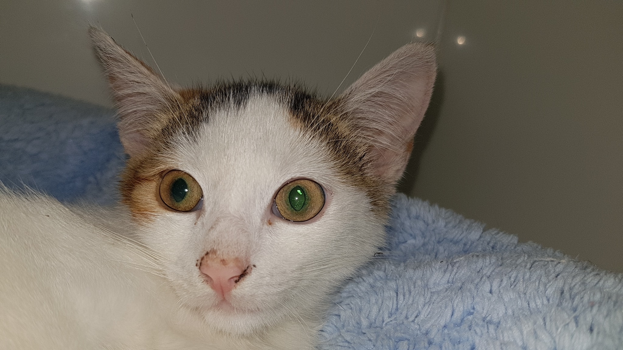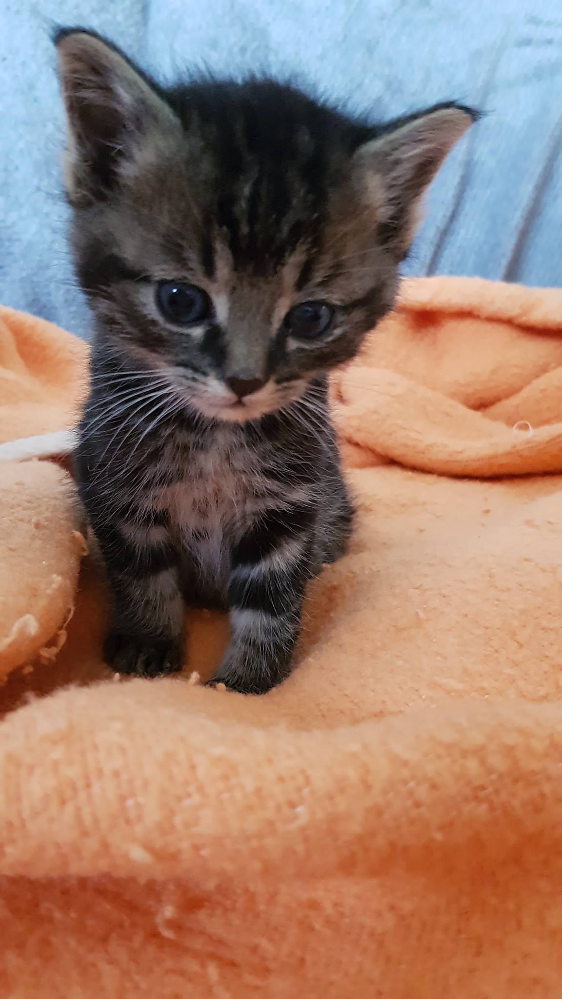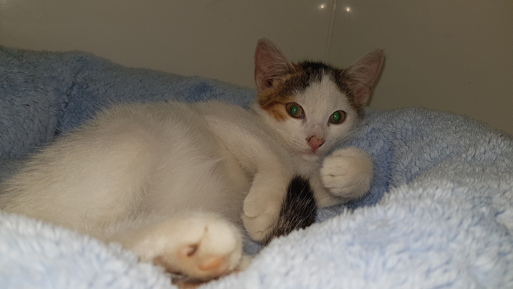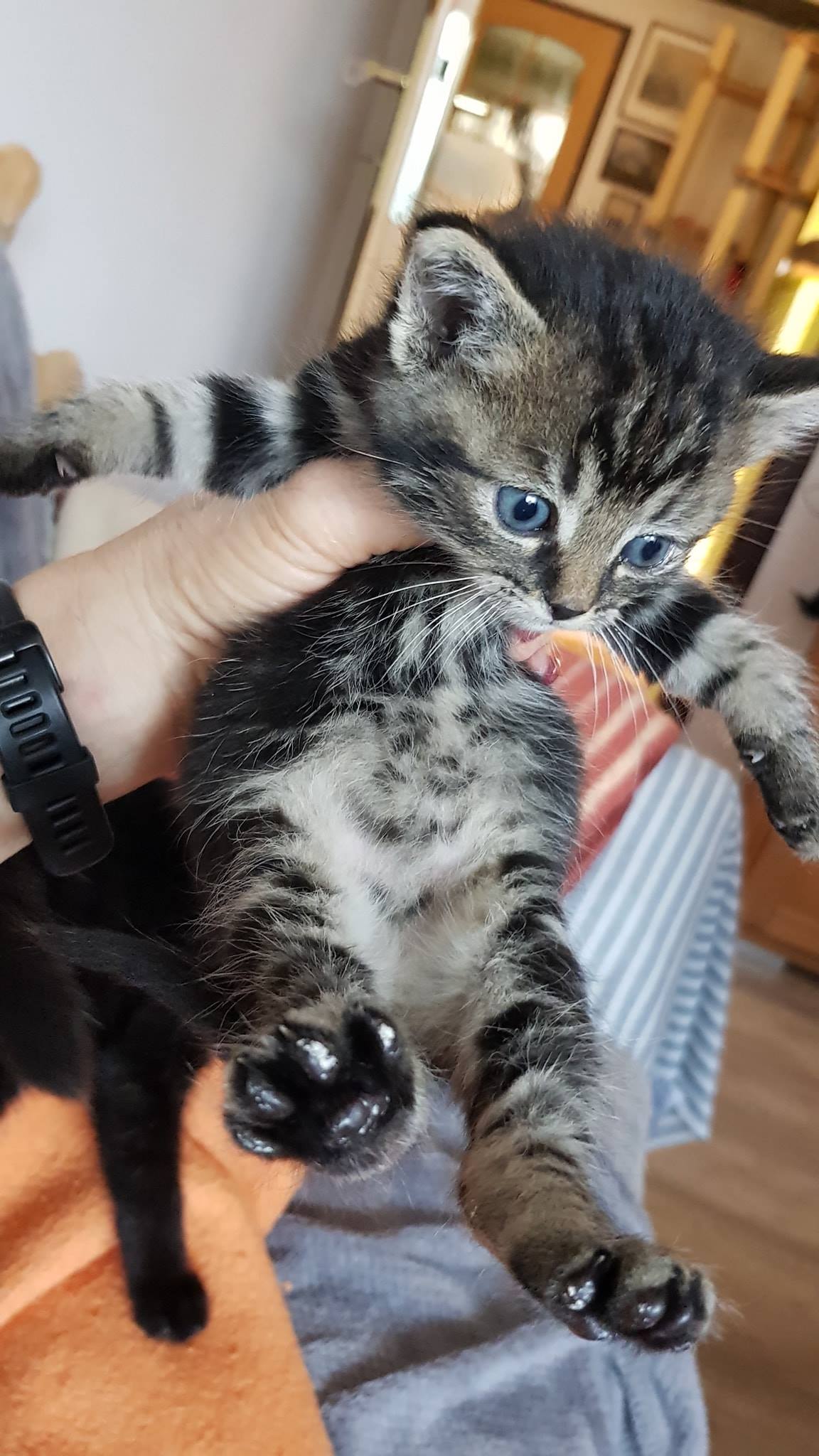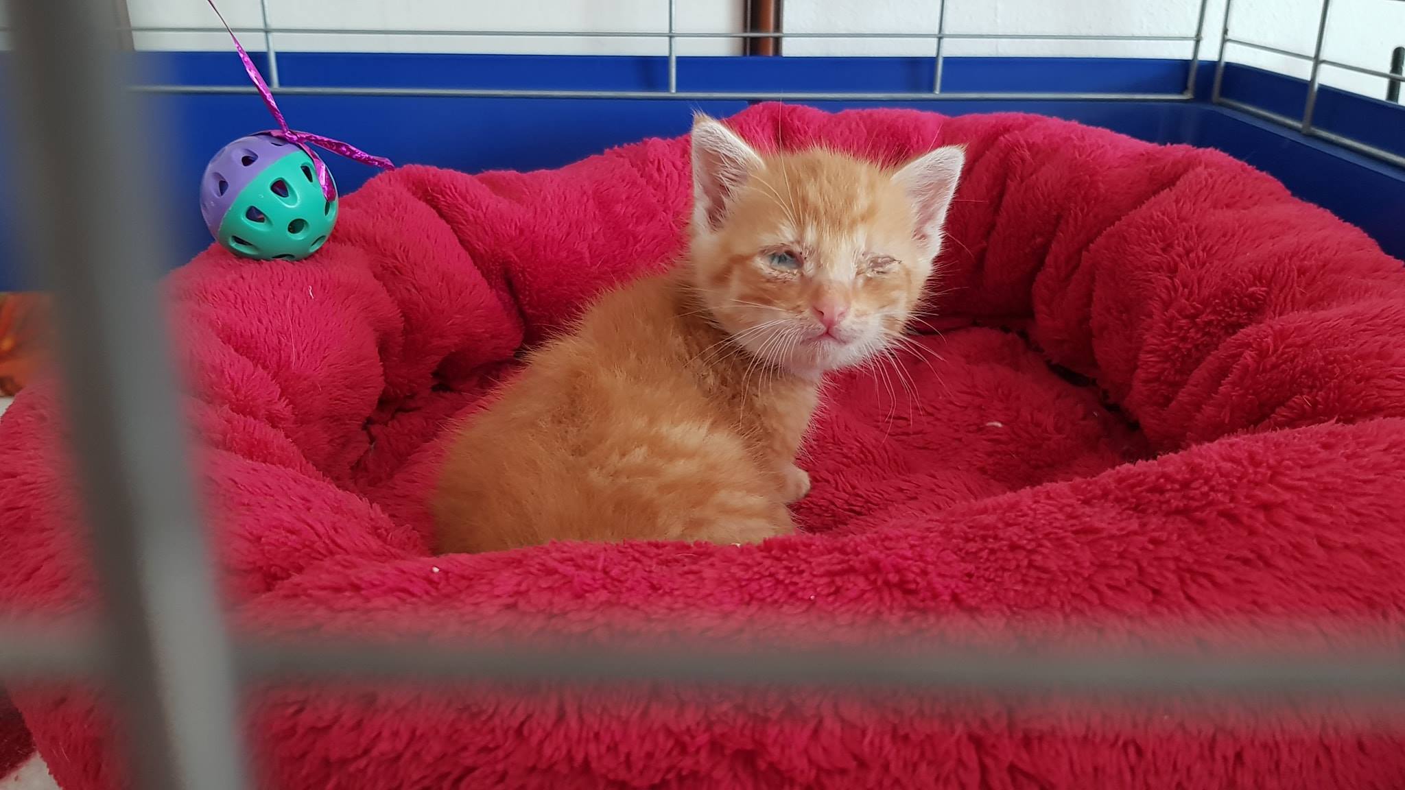 Koťátko Očko, které je po operaci očička, muselo mu být vyjmuto a zašito, se krásně zotavuje, byl na kontrole, všechno je v pořádku, příští týden se vyjmou stehy, bude moci být naočkovaný a bude moci se těšit na nový domov.