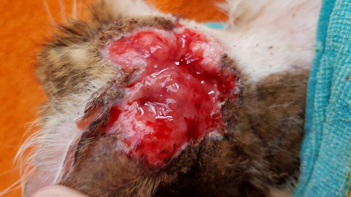 Jak již Michal informoval, museli jsme ošetřit živou ránu bílomourovatého plaššímu kocourkovi, který je ve Sluníčku od minulé středy. Po ošetření v narkóze se mu zase vytvořil veliký strup, který bylo třeba odstranit a ránu namazat. Ještě, že tu mám Michala, který nyní Sluníčku hodně pomáhá. Kocourek je plachý, já pokousaná a trošku mám obavu o své ruce. Sama bych kocourka se vším všudy nezvládla. Michal to s kocourkem Školníkem umí a nakonec nás nesežral a vypadalo to, že to neměl ani v úmyslu. Mazel z něho asi nebude, ale zlý také Školník není. Víme však již nyní, že se zcela uzdraví.