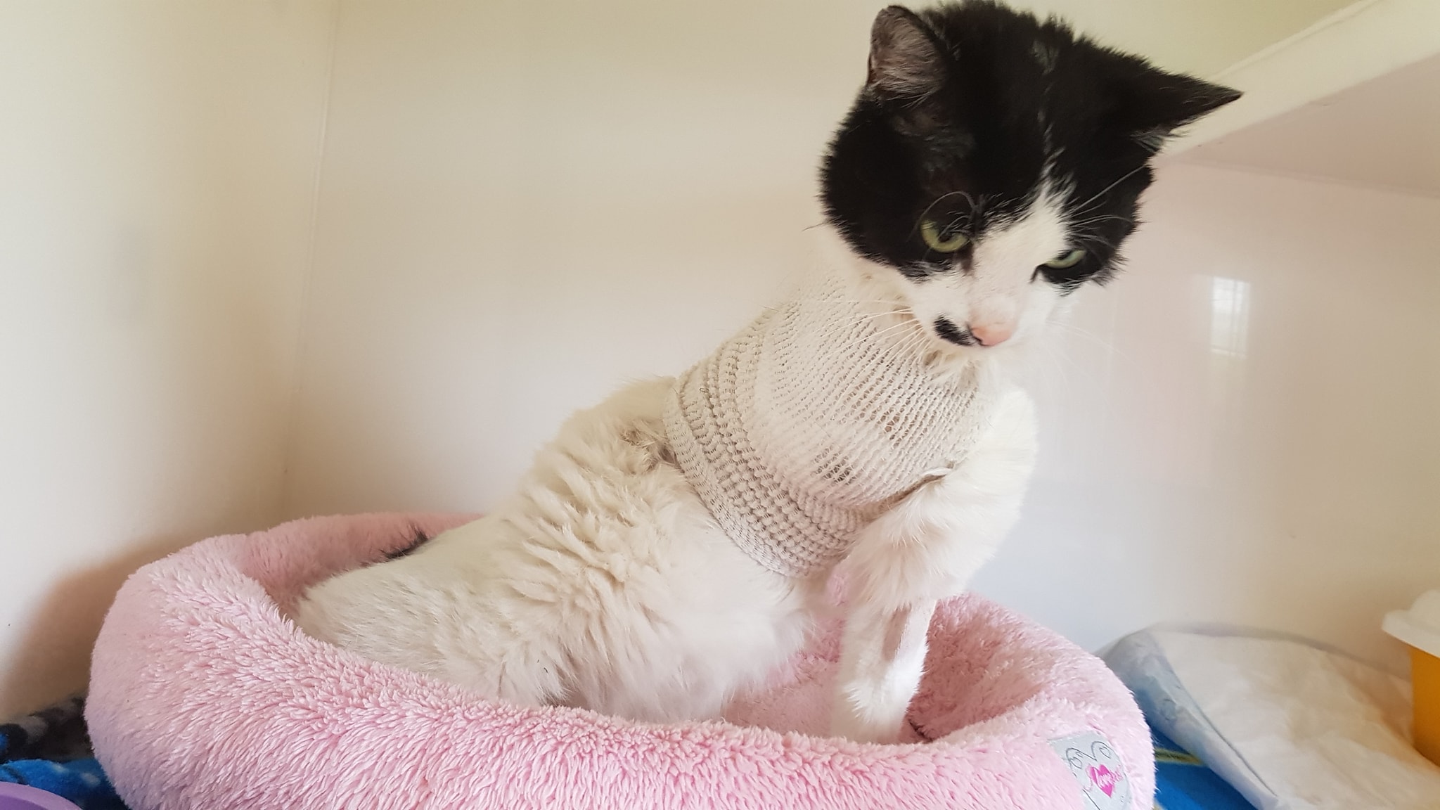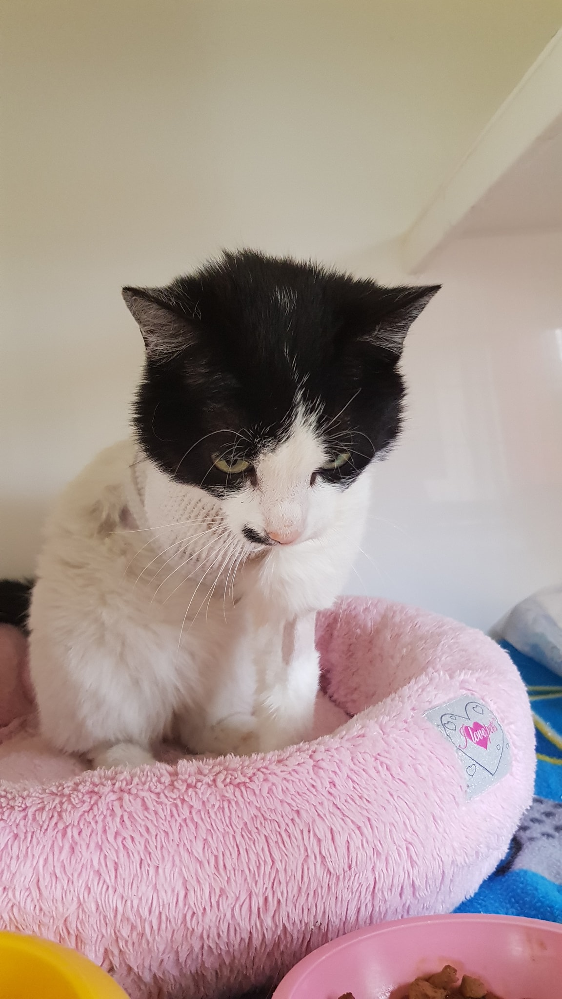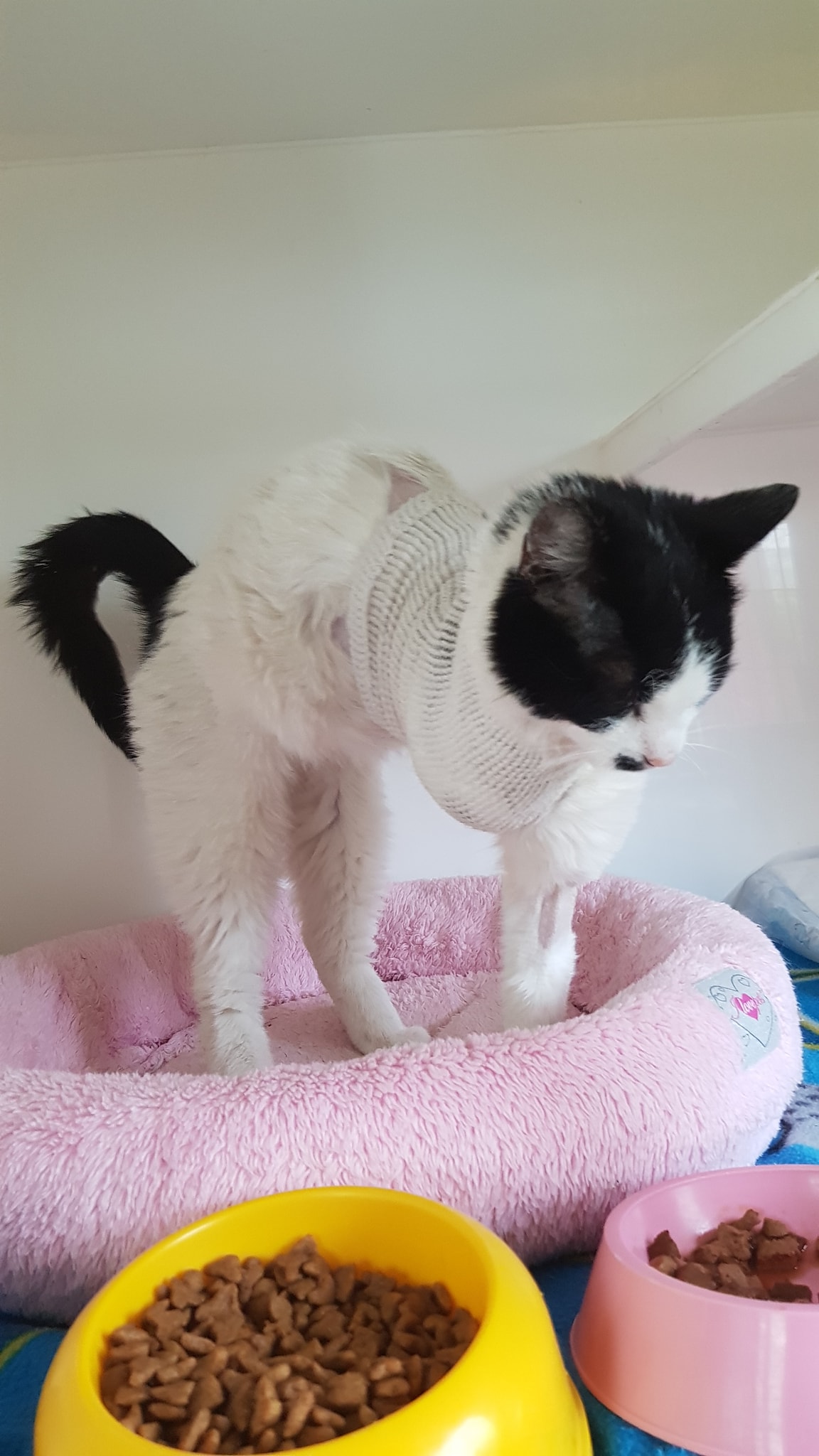 Bíločerná kočička Konstancie pořád špatně dýchá. Na rentgenu plic byl nalezen menší nález, léčba byla změněna a my doufáme, že zabere. S chronickými rýmami a záněty plic je nyní u nově přijatých kočiček po zimě docela problém.