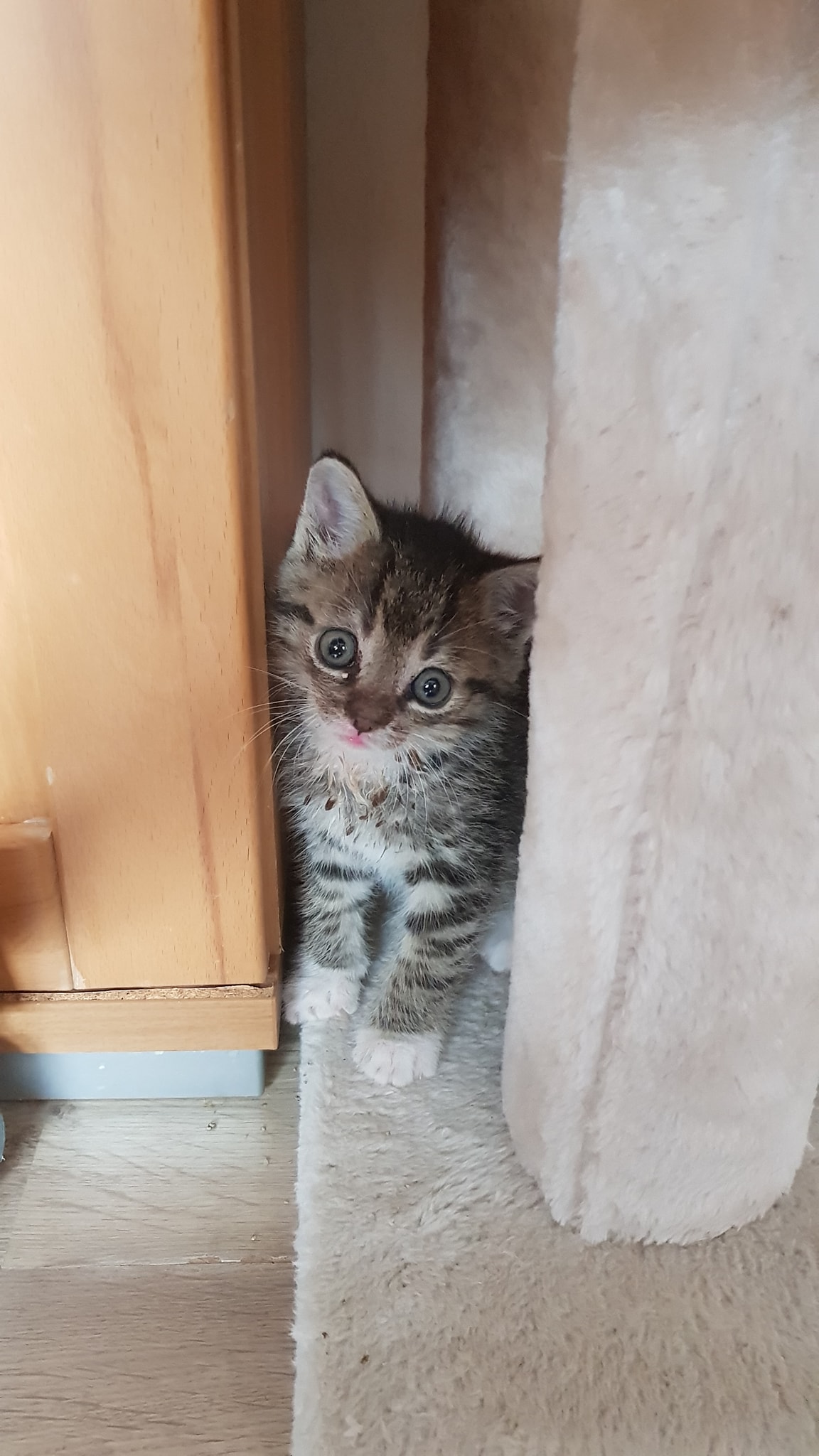 Třetím kocourkem z Vědomic je mladý, kouřový kocourek Carlos. Bohužel se nám stalo při přenášení kocourka v přepravce z auta, když byl po kastraci, že se nám přepravka rozpadla a kocourek utekl. Byla to pro nás velká tragédie, kocourka neustále hledáme, roznosili jsme letáky, věděli jsme, že se ukryl někde v okolí. Včera večer ho konečně Michal nachytal u dveří, když jedl z misky. Ještě jsme ho nechtěli stresovat naháněním, od zde zdomácní, na jídlo bude chodit pravidelně a pak se ho snad podaří opět lapit. Kočičky z Vědomic byly odchytávány do sklopce, jsou trošku nedůvěřivý, byly zvyklé žít volně venku, prostě vesnice. Nejsme na tuto situaci zrovna hrdí, ale i to se prostě stane, i když je to moje noční můra. Ještě, že se nehoda stala před útulkem. Musíme zvážit nákup řádných přepravek, které není radno často rozkládat.