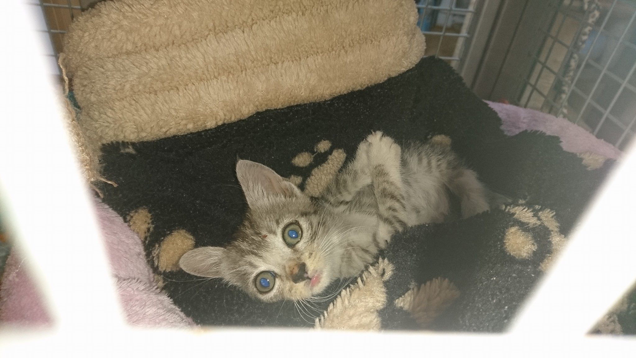 Maličké kotě Proužek v pátek a v sobotu zvracel a střídavě měl průjem. Měla jsem o něho obavu, ale vypadá to, že už je to dobré. Běhá po kleci, hraje si a hezky baští.