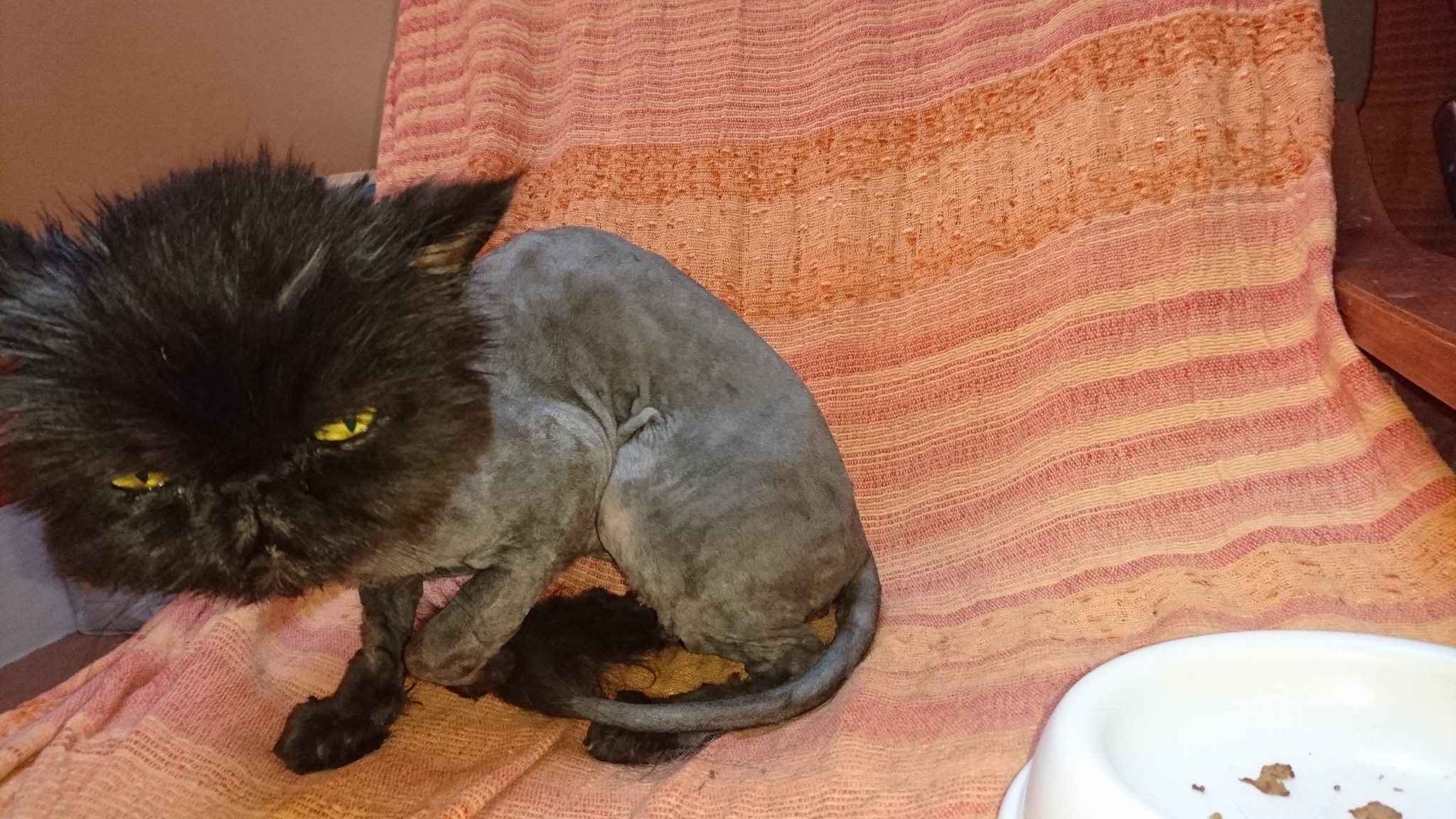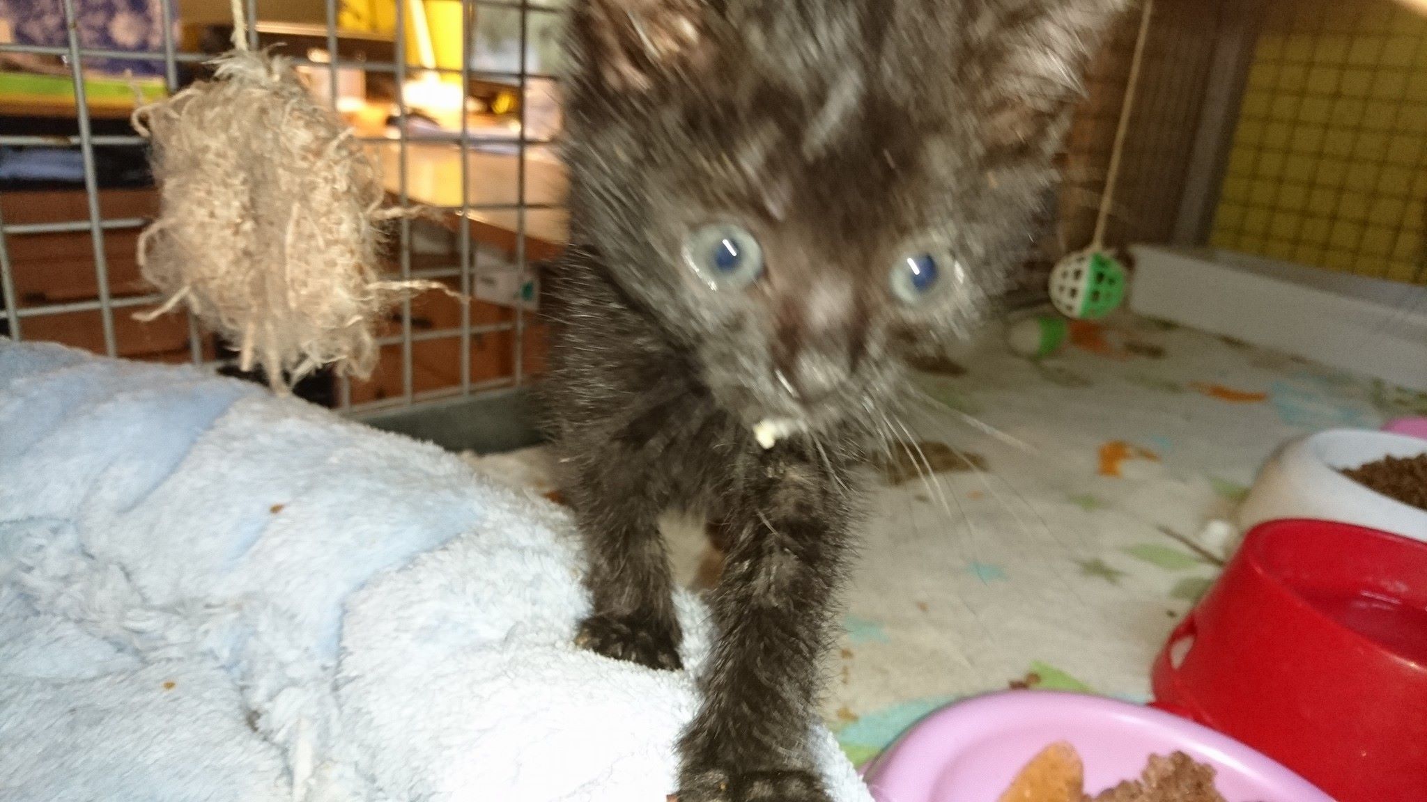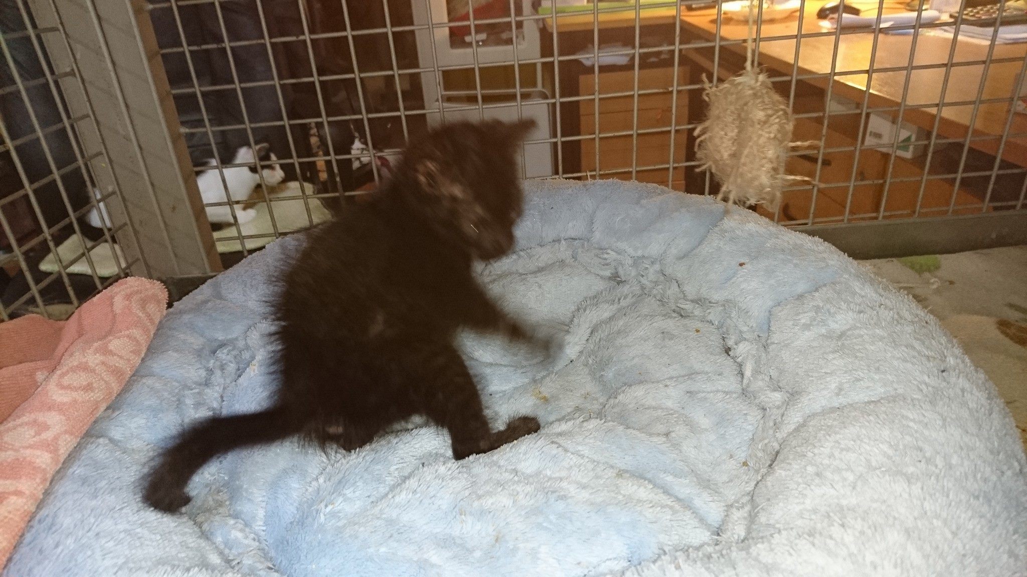 Černé miminko Vetík byl na kontrole s plísní. Ta se nijak nelepší a tak musely být nasazeny antimykotické léky. Takový mrňousek a takové trápení. Musí být chuděrka pořád izolovaný. Je úžasný, hraje si v kleci, krásně baští konzervu, je to zlatíčko maličkaté.