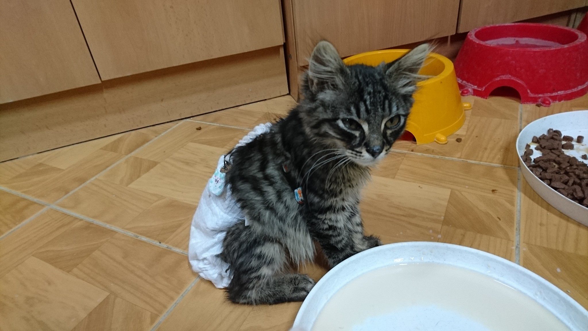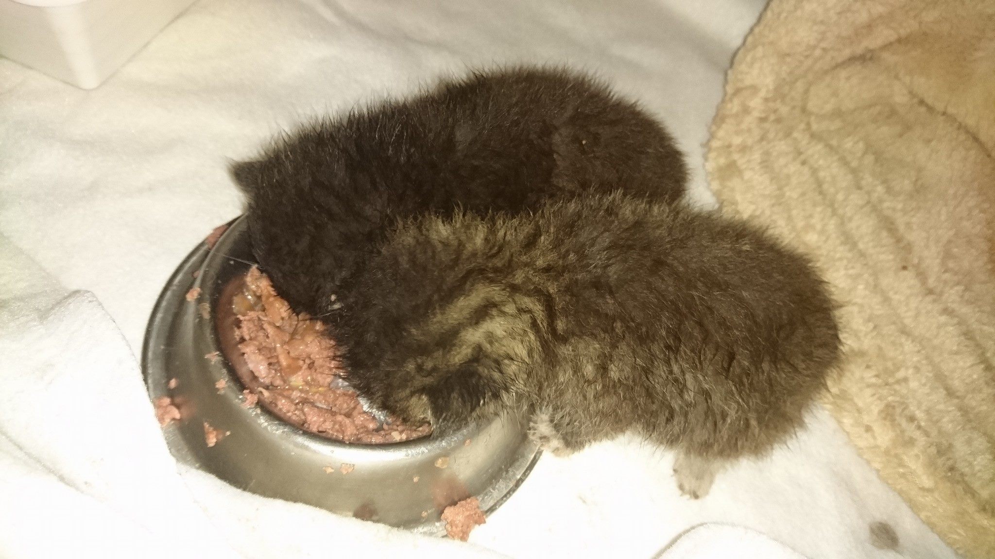 Dneska opět nově dvě koťátka ve Sluníčku zhruba dva a půl týdne staré. Byly nalezeny v pneuservisu v Krabčicích. Celý den plakaly pod pneumatikama. Jedná se o černou kočičku s bílýma tlapičkami a náprsenkou, vážící 236 gramů, dostala jméno Pneuška a mourovatého kocourka s váhou 241 gramů se jménem Servík. Obě koťátka byla strašně moc hladová a špinavá. Vrhla se na misku s kotěcí konzervou, ale neuměla ji moc pozřít. Lahvičku s kotěcím mlíčkem neumí sát, je jim nepřirozená. Je to na hlavu.