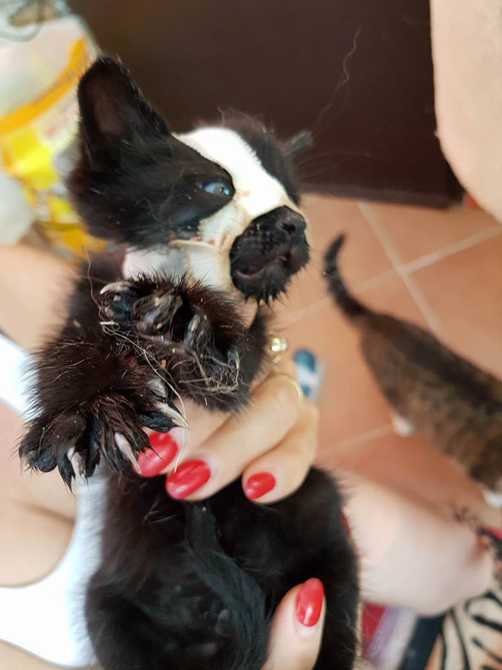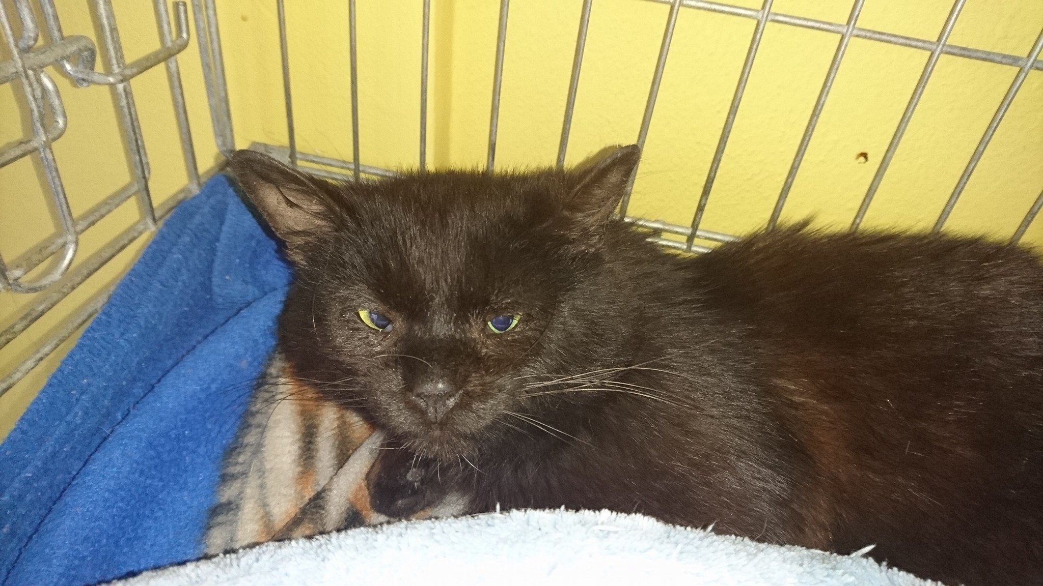 V sobotu, v den bazárku, jsme přijali kocourka z Ústí nad Labem, kterého jsme neúspěšně inzerovali. Je to černý, malý kocourek středního věku se zahnisanýma očima, dvakrát zlomeným ocáskem a s velkým zánětem dásní. Venku se sice nechal pohladit, ve Sluníčku je velice vystresovaný. Dnes v noci konečně trochu jedl. Je zvyklý venku, na své prostředí a lidi strpí pouze kvůli přísunu potravy. Dnes je jeho stav o něco lepší, užívá antibiotika.