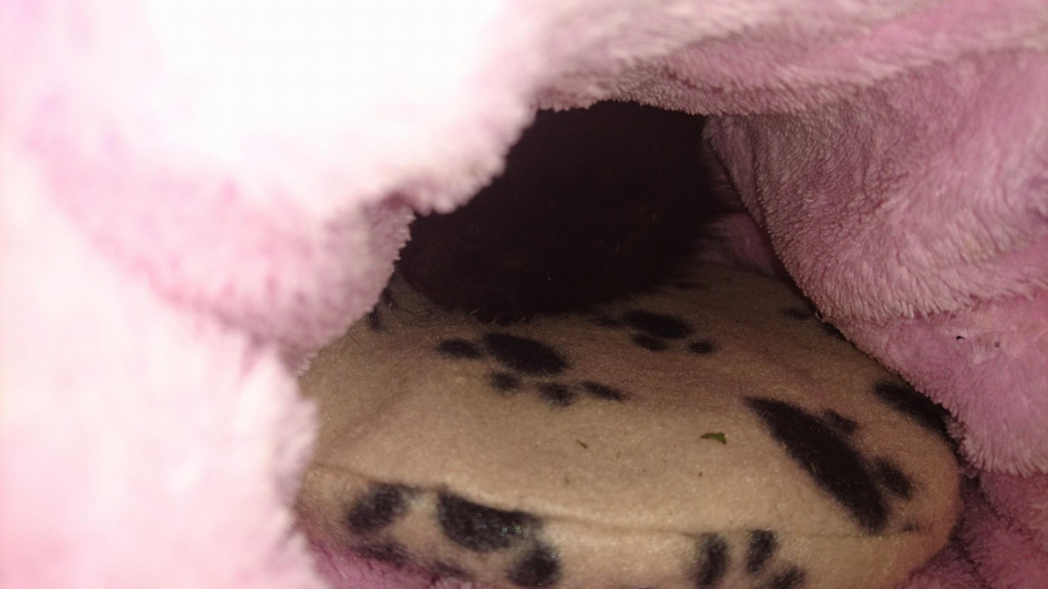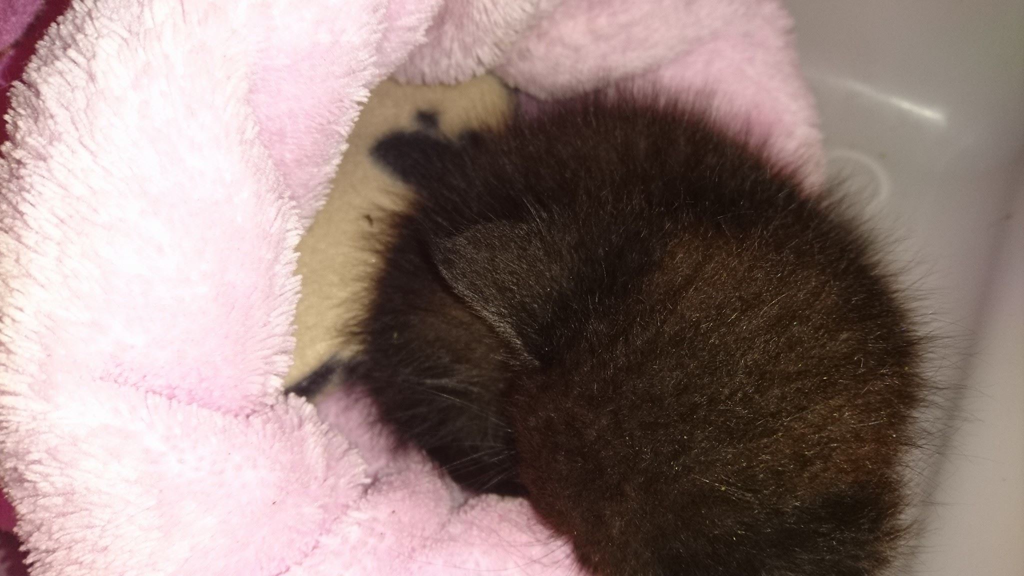 Dneska máme další příjem z obce Libotenice, kde v trávě u školy plakalo sesláblé malé černé kotě. Slyšela ho občanka, která bydlí opodál. Je to chlapeček, byl příšerně prochladlý, studený, je hubeňoučký, váží 202 gramů, je mu cca 14 dní. Trošičku už jedl a je nyní na vyhřívané dečce.