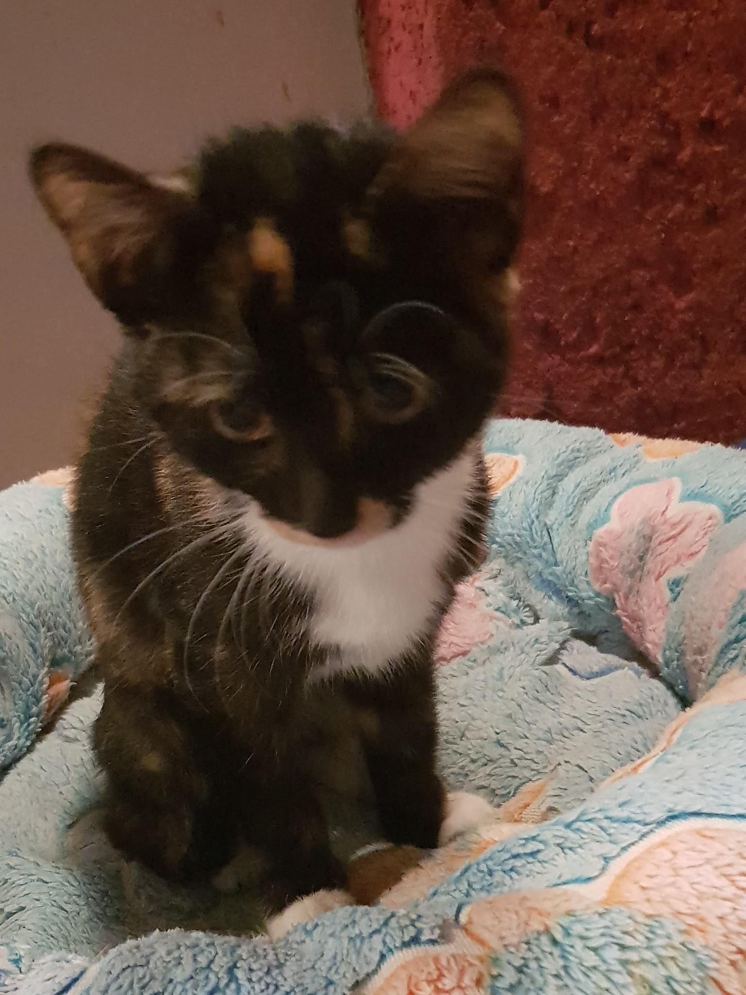 Včera jsme přijali tříbarevnou, krásnou, asi tříměsíční kočičku Missi. Je to neskutečný mazel, nechce být vůbec sama, je to závisláček na lidech.