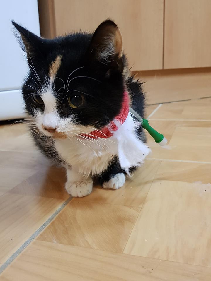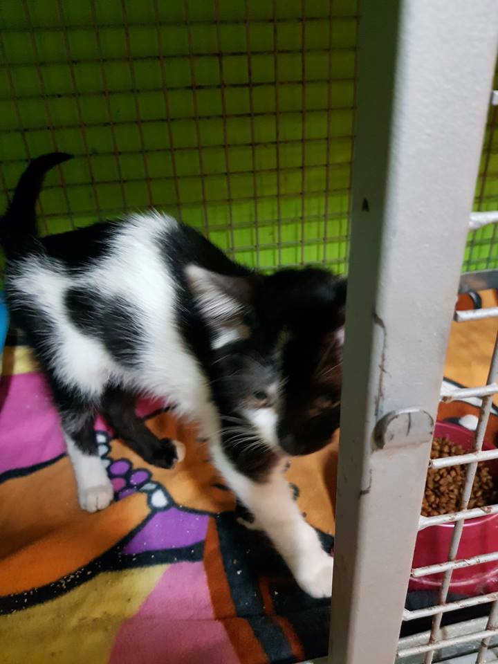 V minulém týdnu přijaté černobílé koťátko Grobiánek se mi vůbec nelíbí. Je strašlivě hubený, úplně průsvitný. Prozatím dostal důslednější odčervovací kůru. Začínám mít o něho starost, jídlo mu moc nejede.