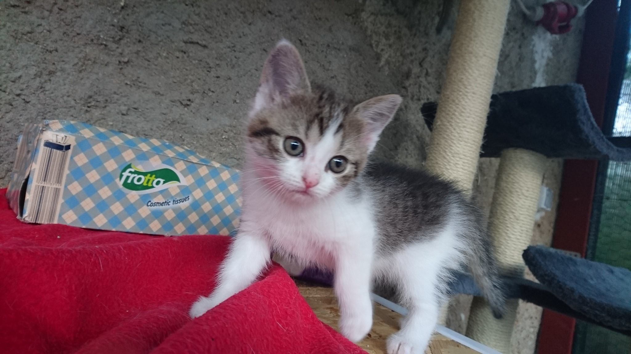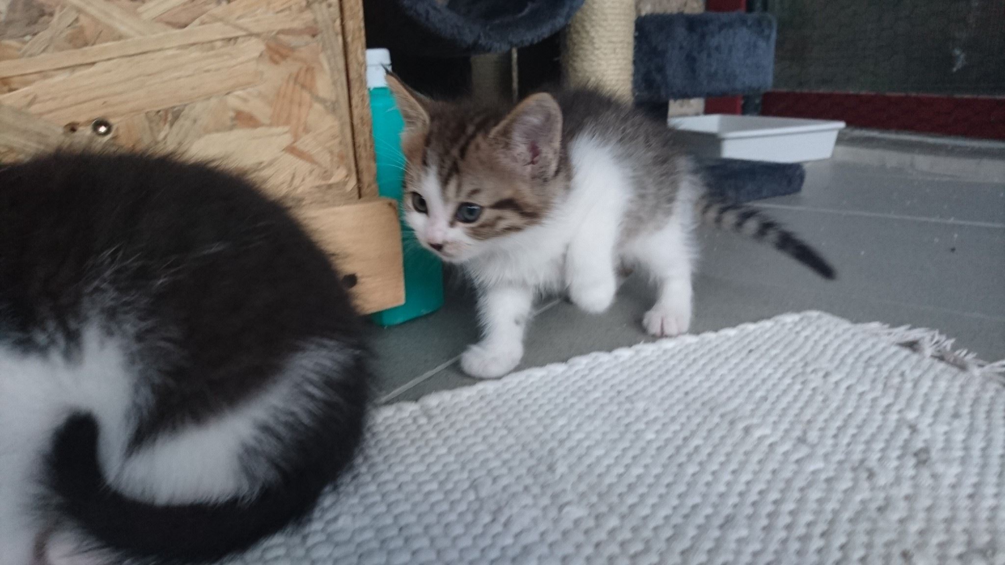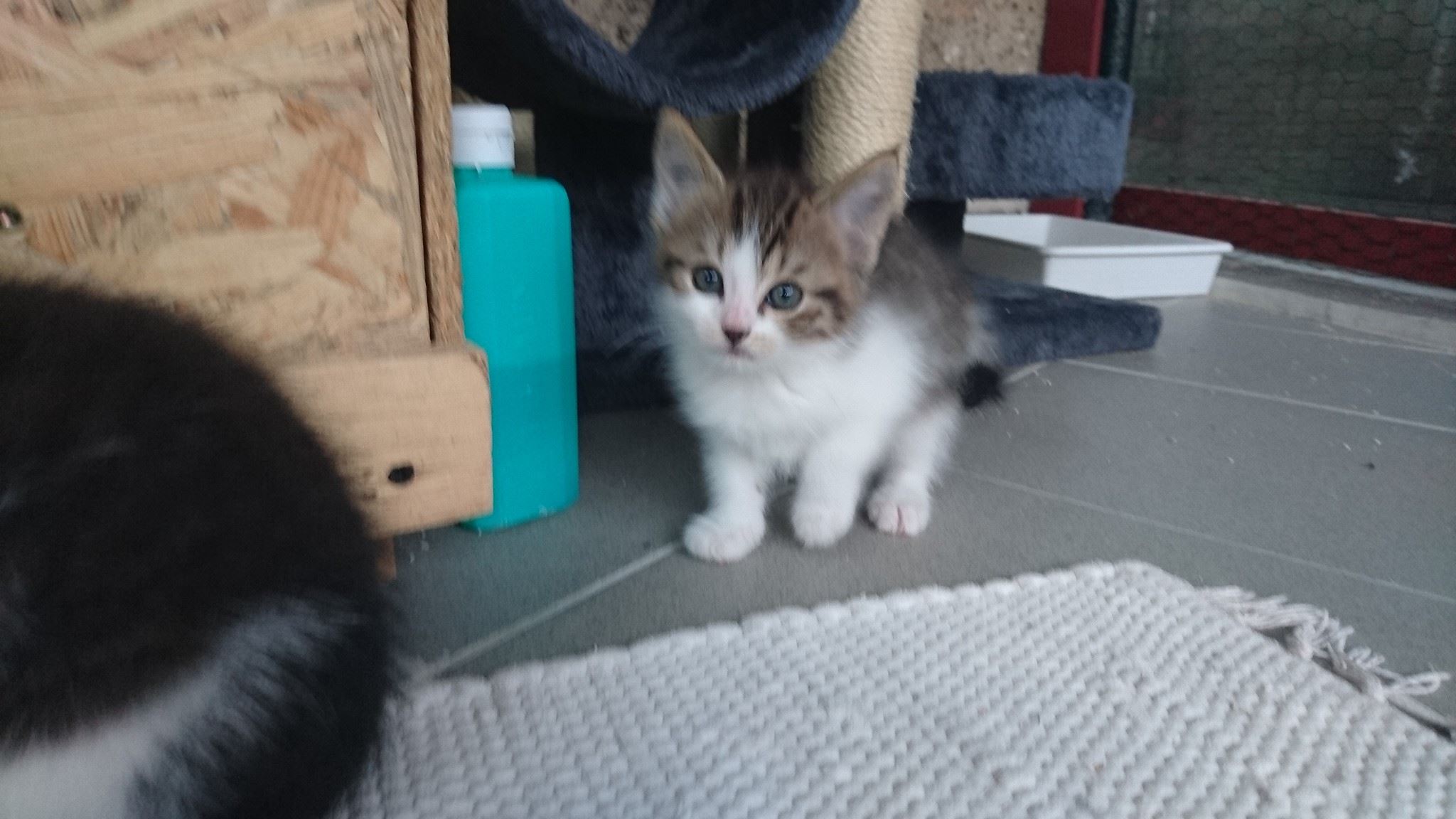Třetí bráška Štaflíčka a Špagetky, bílomourovatý kocourek Muffínek. Bylo těžké ho odchytit, je plašší než Štaflíček a Špagetka. Doufám, že se ochočí, je moc hezký. Zatím si s brášky nehraje, je spíš pořád sám někde v koutě.