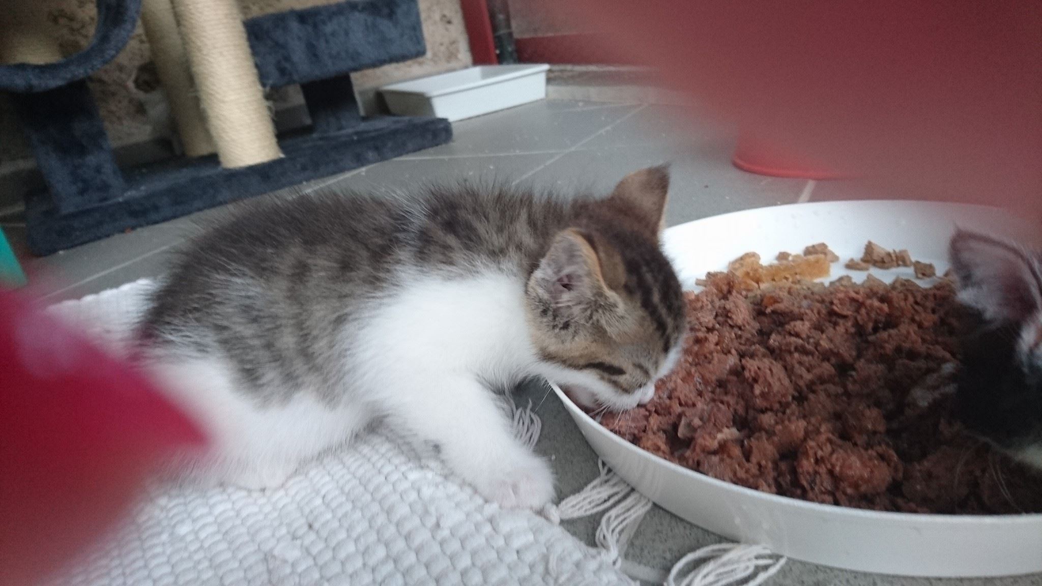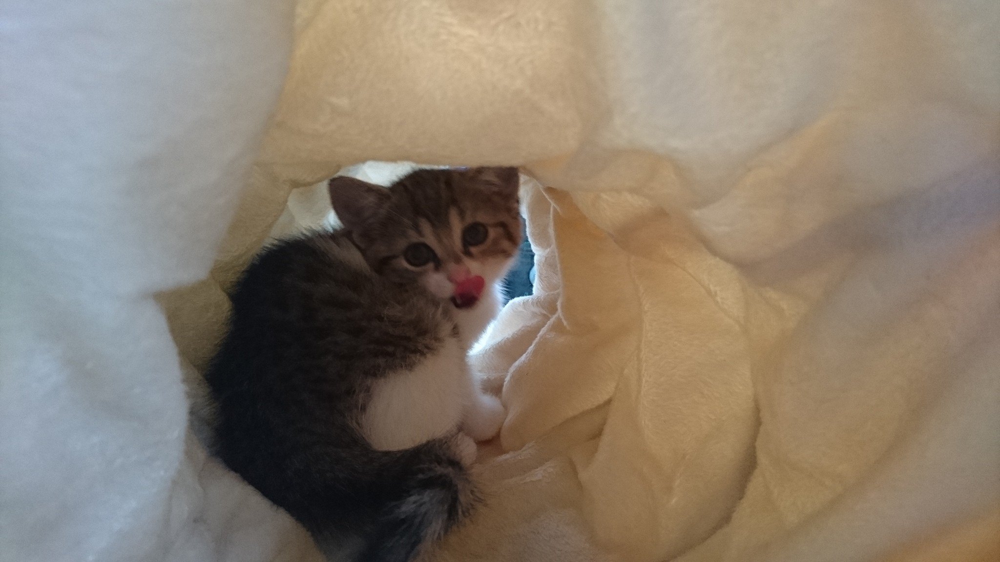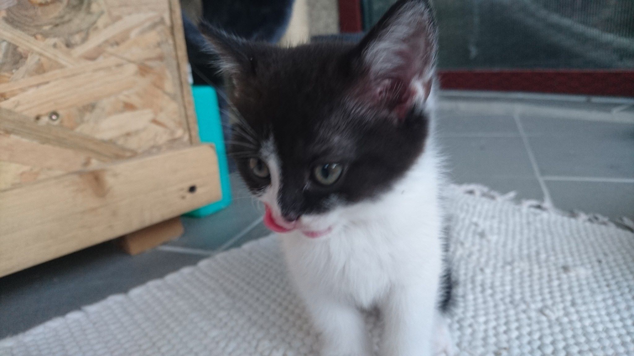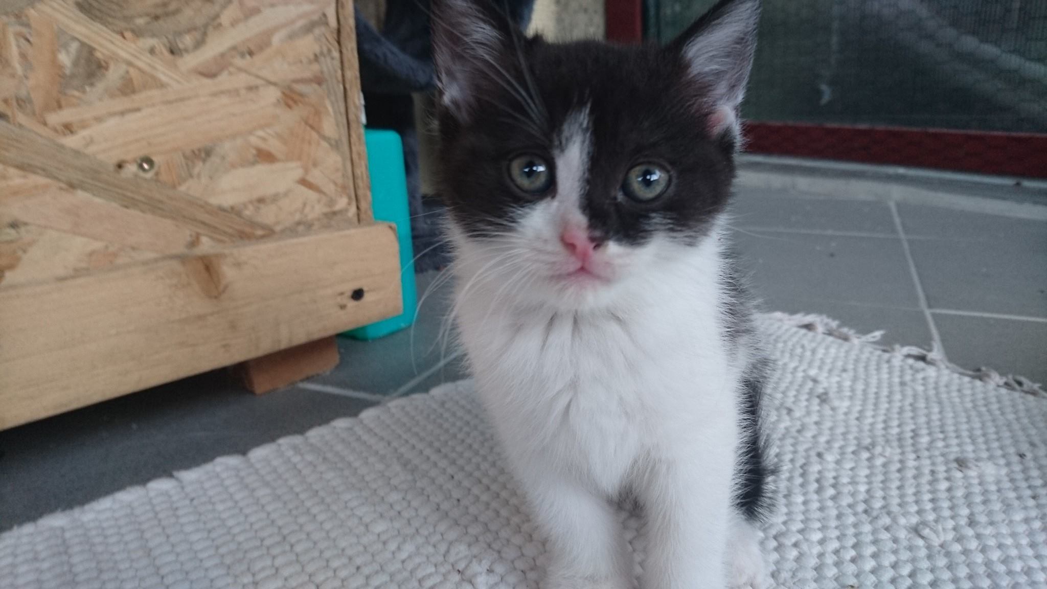 Třetí bráška Štaflíčka a Špagetky, bílomourovatý kocourek Muffínek. Bylo těžké ho odchytit, je plašší než Štaflíček a Špagetka. Doufám, že se ochočí, je moc hezký. Zatím si s brášky nehraje, je spíš pořád sám někde v koutě.