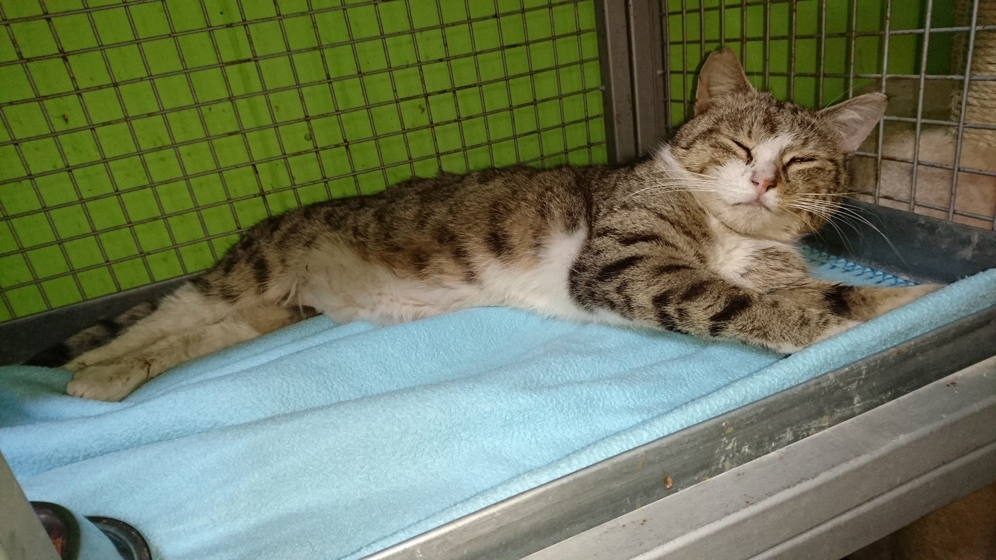 Dnes ráno jsme přijali bílomourovatého asi čtyřletého kocourka se zraněním nožičky, pusinky a očička. Kocourek je celý bolavý, nejvíce na zadní levé nožičce, je apatický, nechce nic jíst. Byl nalezen v zahrádkářské kolonii v Hoštce. Měli jsme podezření na zlomeninu zadní nožičky. Vyšetřením na veterinární klinice se naštěstí zlomenina neprokázala. Kocourek je celý pohmožděný, pokousaný a zraněný i na rtu a v puse, oční bělmo má krvavé, dvě díry na vnitřním stehně, spoustu klíšťat. Je ošetření, má antibiotika a léky proti bolesti. Pořád jen leží. Dostal jméno Hošťáček.