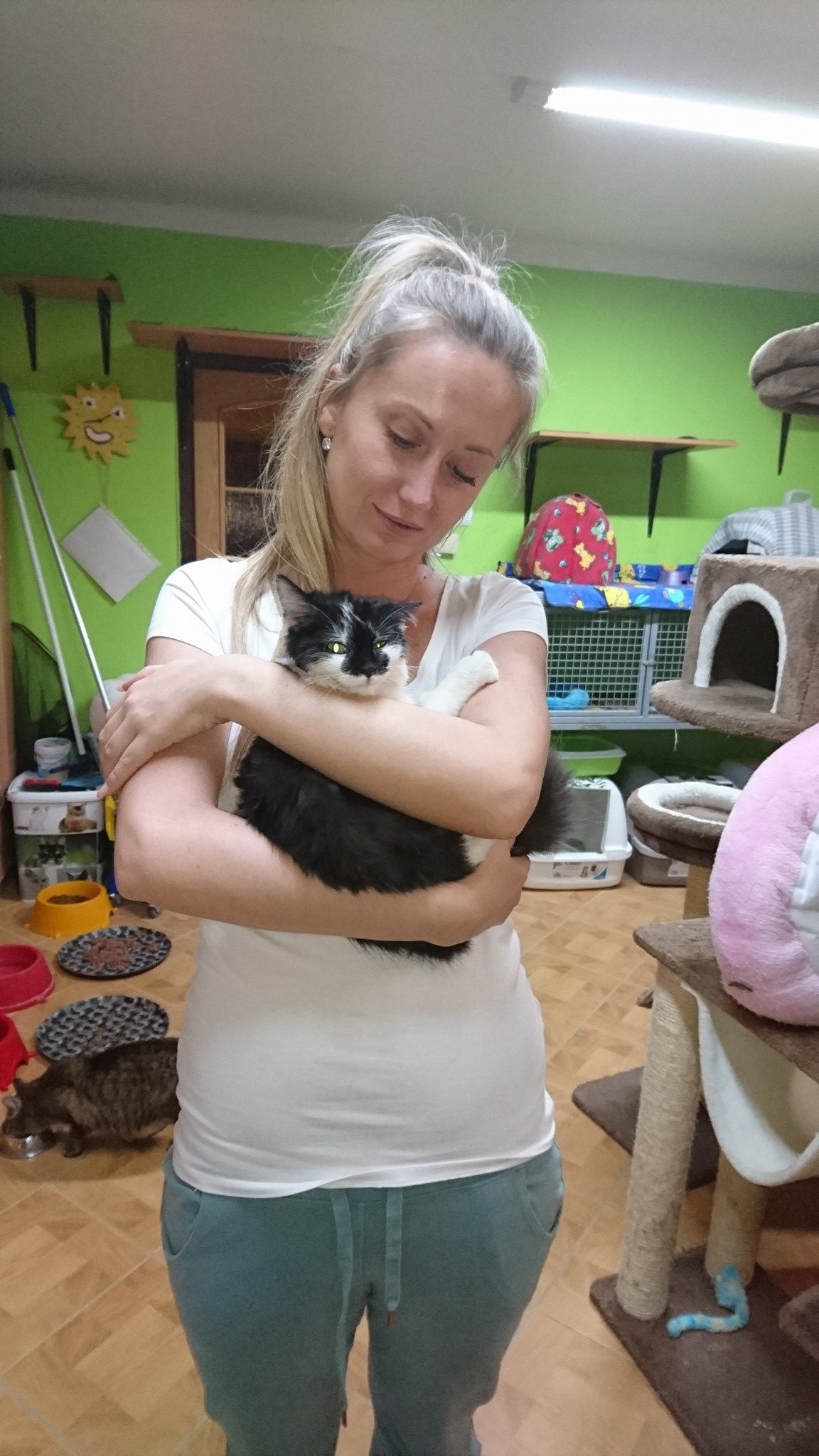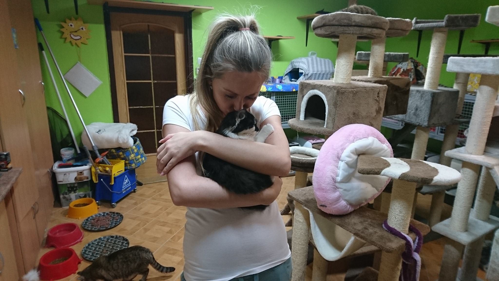 Máme novou dobrovolnici Danielu z Ústí nad Labem, která jezdí z docela velké dálky pomáhat s úklidem a mazlit Sluníčka. Oblíbila si kocourka Chlapečka, viz. foto. Daniele za pomoc ve Sluníčku děkujeme.