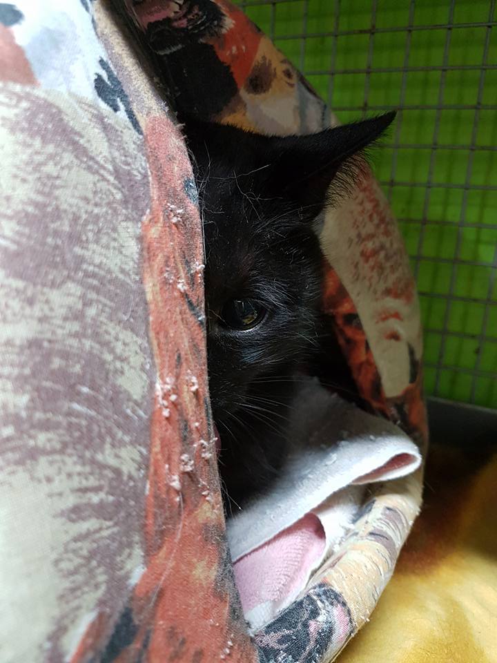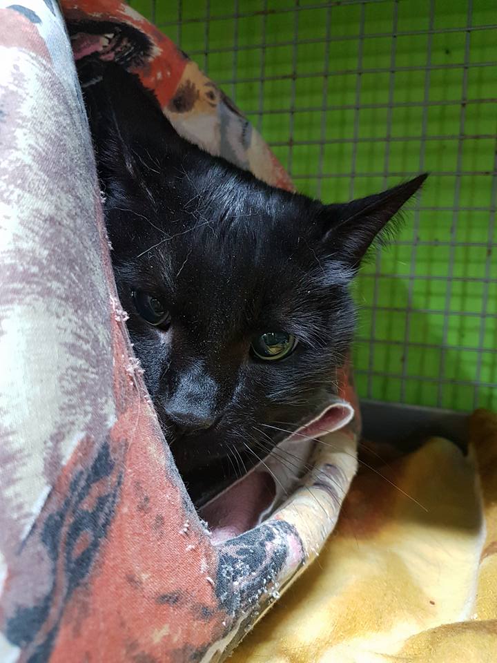Ráno přivezli do Sluníčka dva mladí lidé černého velikého kocourka, kterého údajně vyhodili ze zeleného favorita na silnici mezi Benzínovem a Předonínem. Kocourek utíkal ze silnice a do křoví a poté se vrátil, lidé ho naložili do kufru auta a přivezli do Sluníčka. Kocourka jsme donesli do klece a za chvíli se už nedalo na něho sáhnout. Má kastrační značku – zástřih na oušku, je krásný, veliký, seká, kouše, je to totální plašan. Jen je divné, že se nechal přivézt. Přemýšlím nad tím, zda nevypadl z motoru favorita, neboť lidé, kteří ho přivezli, přímo neviděli, že by ho někdo z auta vyhazova. Objevil se po projetí favorita. Po té byl možná v šoku, nechal se naložit a ve Sluníčku se teprve projevila jeho povaha. To jsem zvědavá, co s ním uděláme, když nevíme, ze které je lokality, abychom ho tam vrátili. Je ohromný, dobře živený a je škoda, že se u nás trápí a zabírá místo přítulným kočičkám, které útulek potřebují. Kocourek dostal jméno Rumburak, zatím je zcela neošetřitelný.